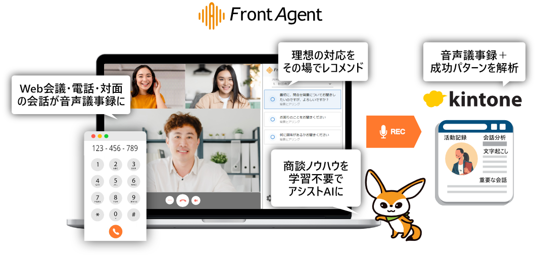 「 Front Agent®」は、WEB会議・電話・対面の会話から自動文字起こしと成功パターンの解析を行い、会話のアシストAI化する商談アシストプラットフォームです。