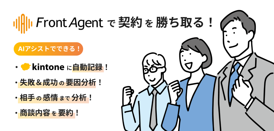 主力製品である「Front Agent®」は、AIと自然言語処理技術を組み合わせたAI商談アシストプラットフォームであり、商談の「要点抽出」、「感情分析」、「効率的で正確な情報共有」、「成功・失敗の要因分析」、「kintoneへの議事録自動登録」などの機能を有します。
