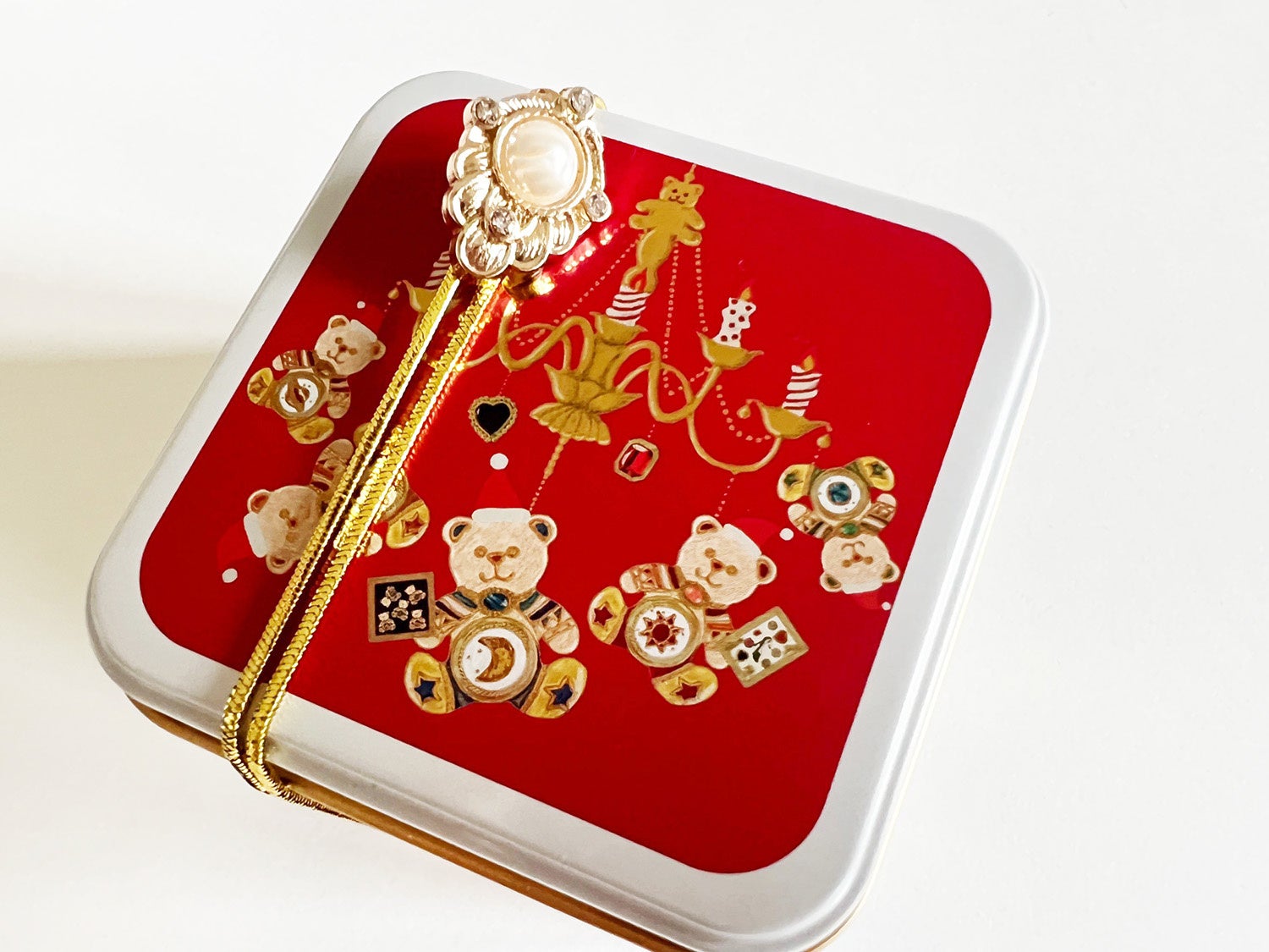 銀座三越のシンボル「シャンデリア」をテーマとして作ったお菓子缶、まるでシャンデリアのようなキラキラボタン付き