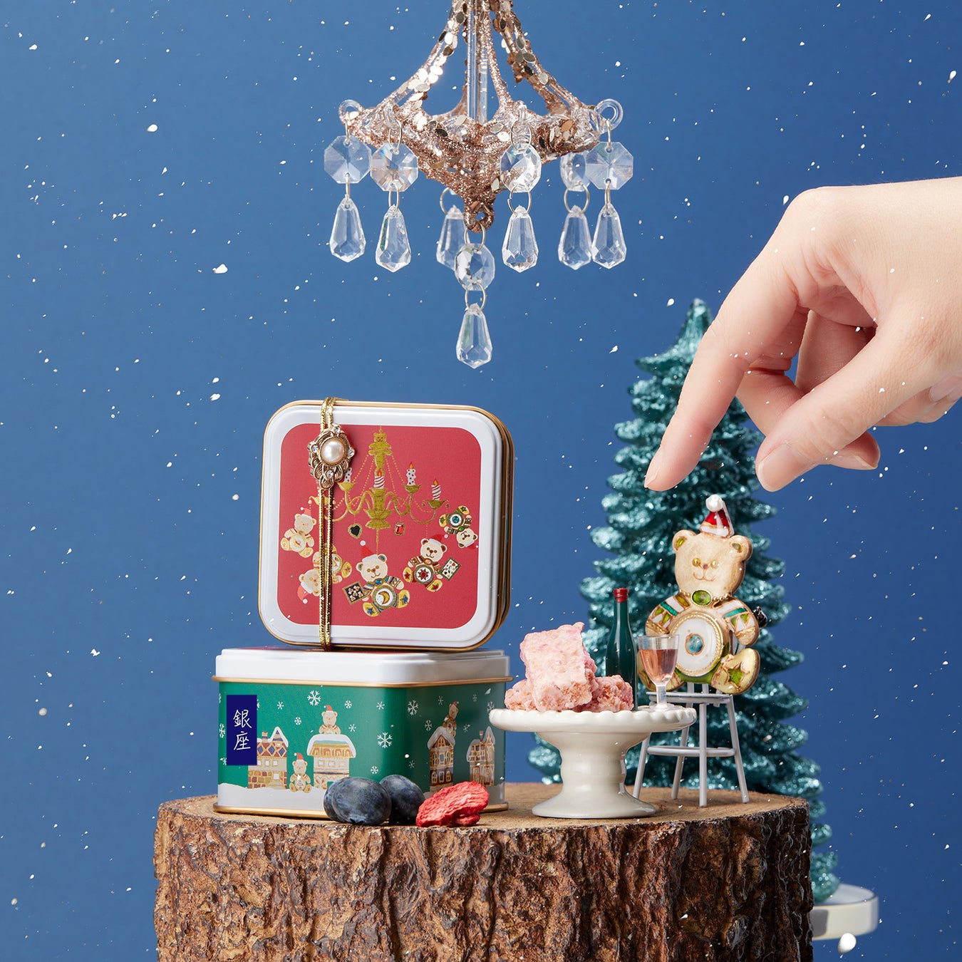 サンタくまが青山デカーボのお菓子缶を持っていたり、
