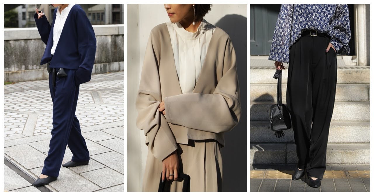 コンパクトなジャケットとタックの効いたパンツが相性抜群。