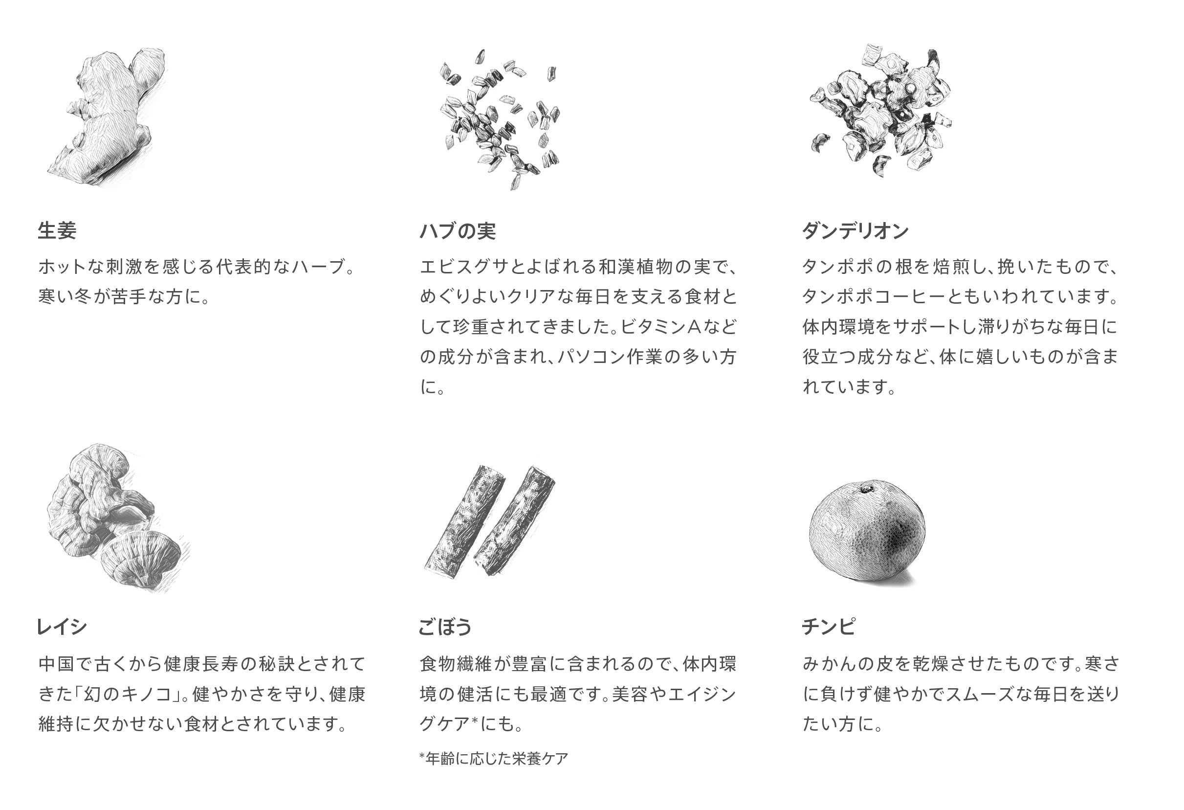 香ばしい香りのハブ茶をベースにごぼうや生姜などを加えた