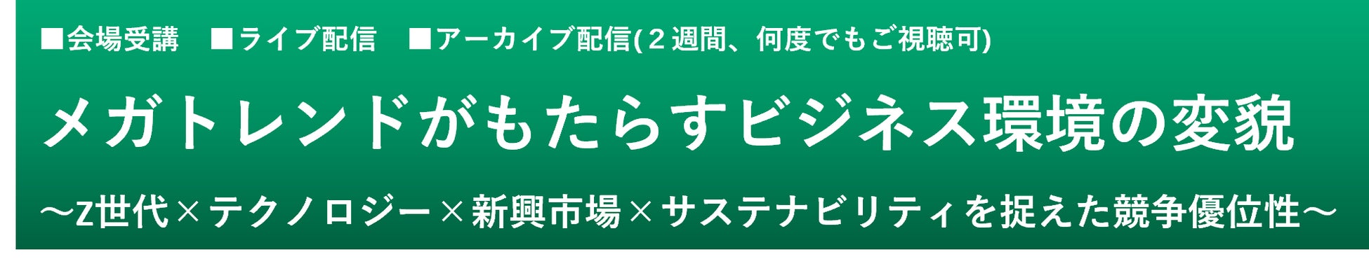 本セミナーでは、これまでにない世界的な常識や価値観、仕組み等を形成するほど強力なマクロ環境的事象であるメガトレンドの中でも、企業が避けては通れない、「Z世代×新興市場×テクノロジー×その他ニューノーマル」の動向を考察した上で、企業が実践すべき環境適応型戦略の方向性を導きます。