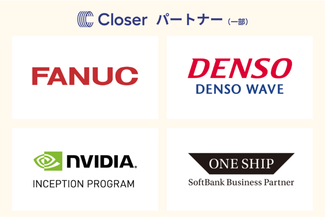 また、Closerは、ファナック株式会社、株式会社デンソーウェーブなどの日本を代表するロボット企業様から、ソフトウエアやハードウエアの提供をいただくことで、PickPacker™ のコントローラへのロボットの接続を実現しています。今後もパートナー企業様との連携を深めることで、より高度な自動化技術の開発に取り組んでまいります。