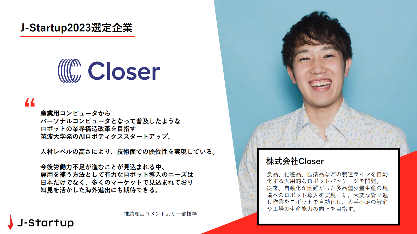 筑波大学発AIロボットベンチャーである株式会社Closer(本社:茨城県つくば市、代表取締役:樋口 翔太)は、経済産業省が運営を行っている「J-Startup」プログラムにおいて、1万社以上のスタートアップから選出されました。J-Startupは、世界で戦い、勝てるスタートアップを政府機関と民間で集中支援を行うプログラムです。