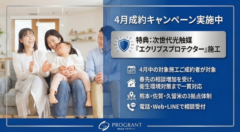 3.熊本・佐賀・久留米の3拠点体制により、資格者による現地確認から封鎖、清掃、衛生環境対策まで一貫対応し、4月中の対象施工ご成約者には次世代光触媒『エクリプスプロテクター』施工キャンペーンを実施します。
