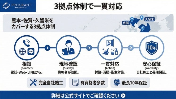 プログラントは、熊本本社・佐賀営業所・久留米営業所の3拠点体制で福岡県・熊本県・佐賀県の広域相談に対応しており、資格者による現地確認から、侵入口の封鎖、糞清掃、臭気対策、衛生環境対策まで一貫してご提案しています。