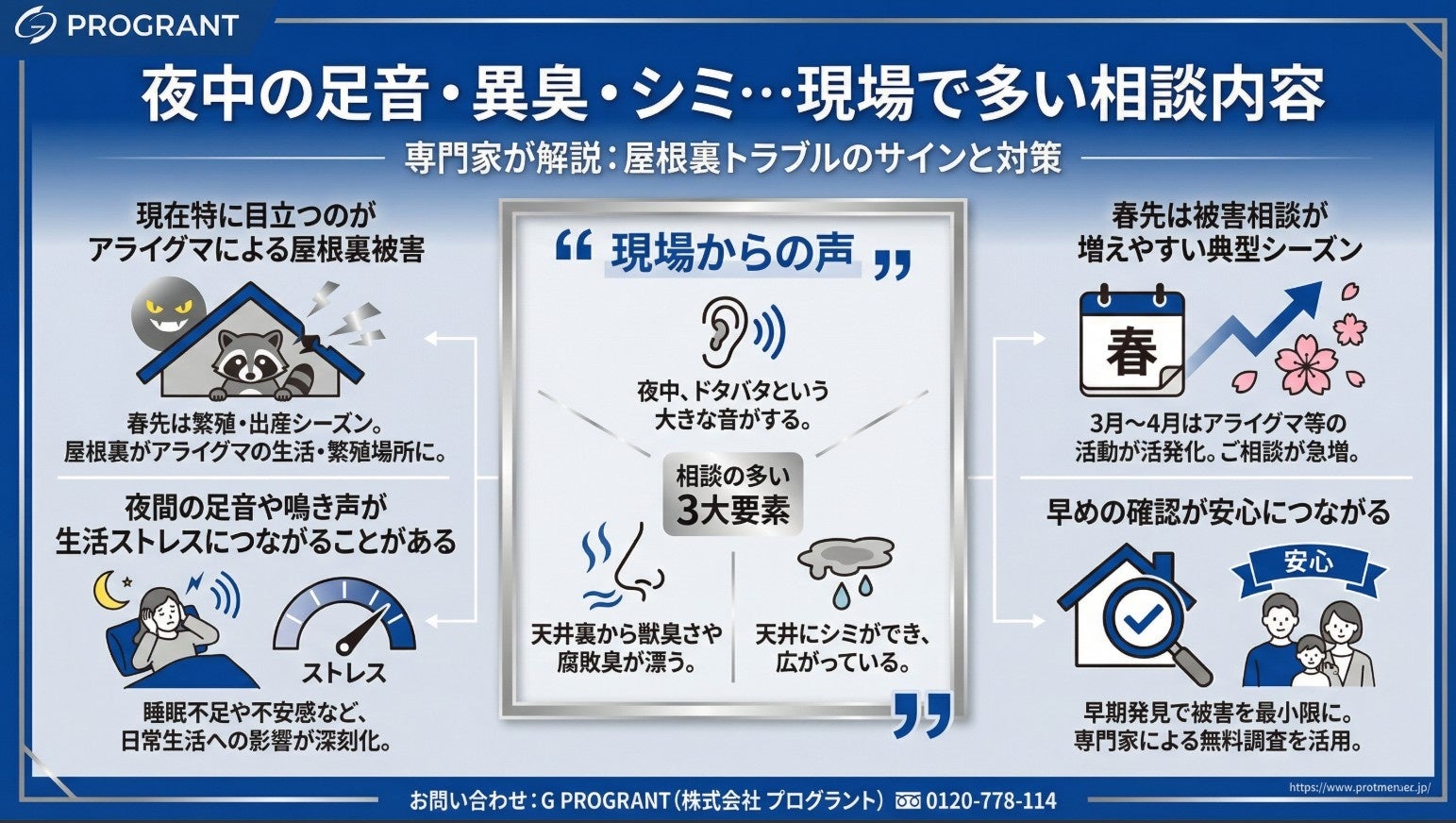 「春先は、屋根裏での物音や異臭に関するご相談が増えやすい時期です。とくにアライグマなどは出産・子育ての場所として屋根裏を選ぶことがあり、被害が進むと糞害や断熱材の損傷、生活ストレスにつながることがあります。プログラントでは、まず現地をしっかり確認し、状況に応じたご提案を大切にしています。少しでも異変を感じたら、早めにご相談ください。」