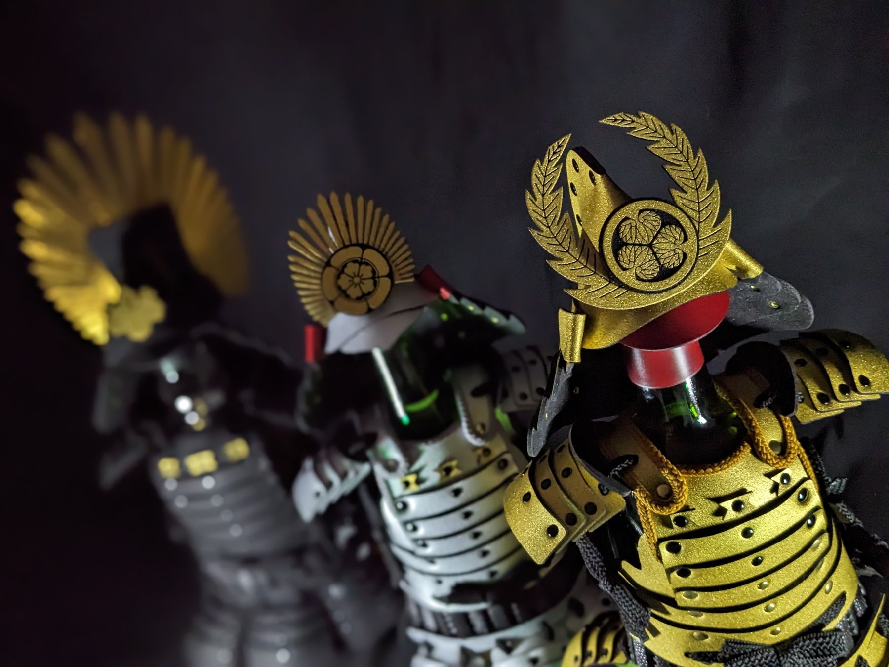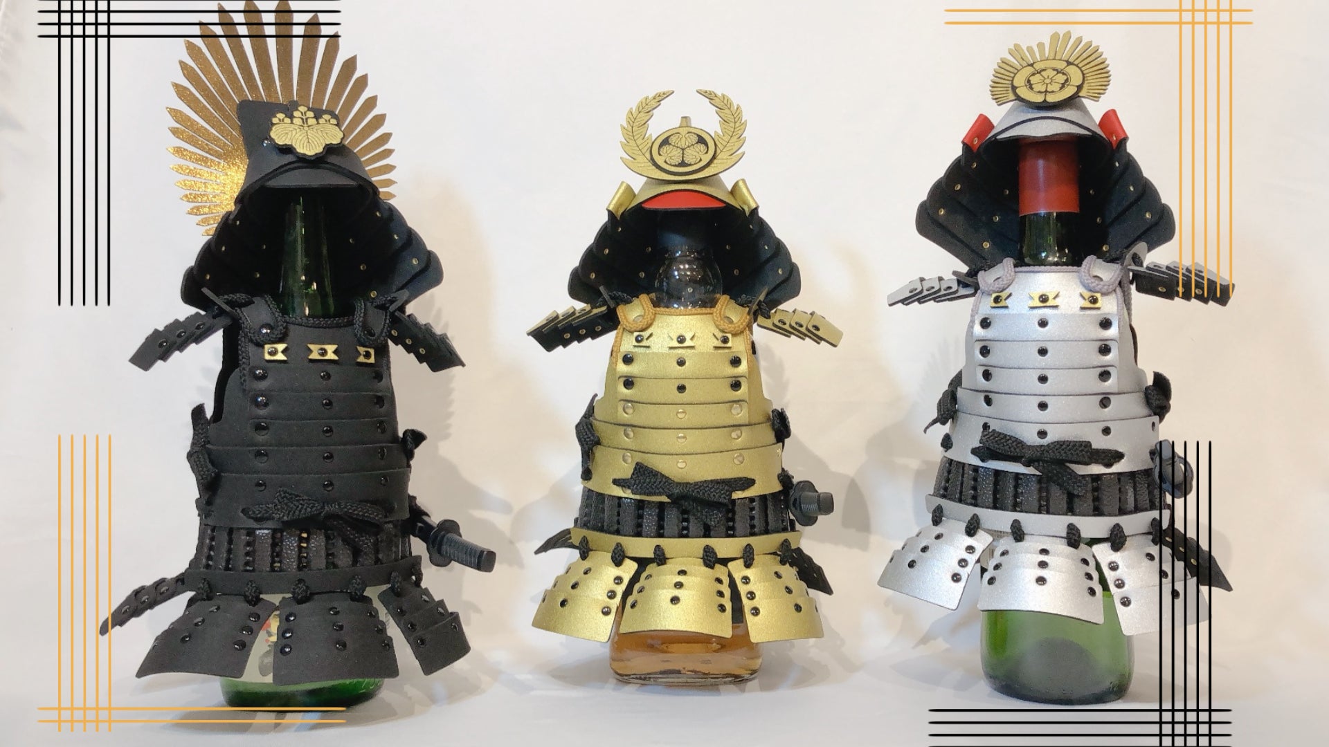 画像左から、日本酒900ml(豊臣)、ウイスキー900ml(徳川)、ワイン720ml(織田)のボトルを護っています。