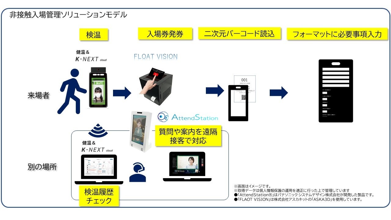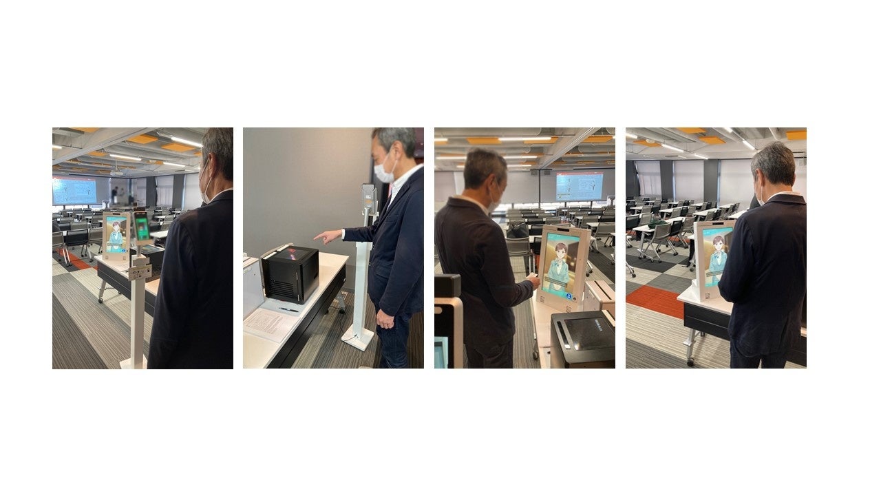 実験では、入場者が検温サイネージ「健温&K-NEXT」で検温を実施。空中結像システム「FLAOT VISION」で発券される体表面温度や二次元バーコードが記されたチケットを受け取り、券面の二次元バーコードから入場申請書にアクセスし、氏名や所属などを記入して入場頂きました。同時に別の場所で「健温&K-NEXT」から発出される検温履歴をモニタリング、アバターで遠隔接客システム「AttendStation®」で、操作が分からないユーザーへの案内や会場案内を行う事で、ユーザーのフォローを実施しました。これらのソリューションの実現で様々な場面で重要作業の1つになっている「入場管理」において「入場者・従業員双方の非接触化」「従業員側の勤務・待機場所を問わず簡単かつ的確な受付作業ができる」といった効果を実現します。