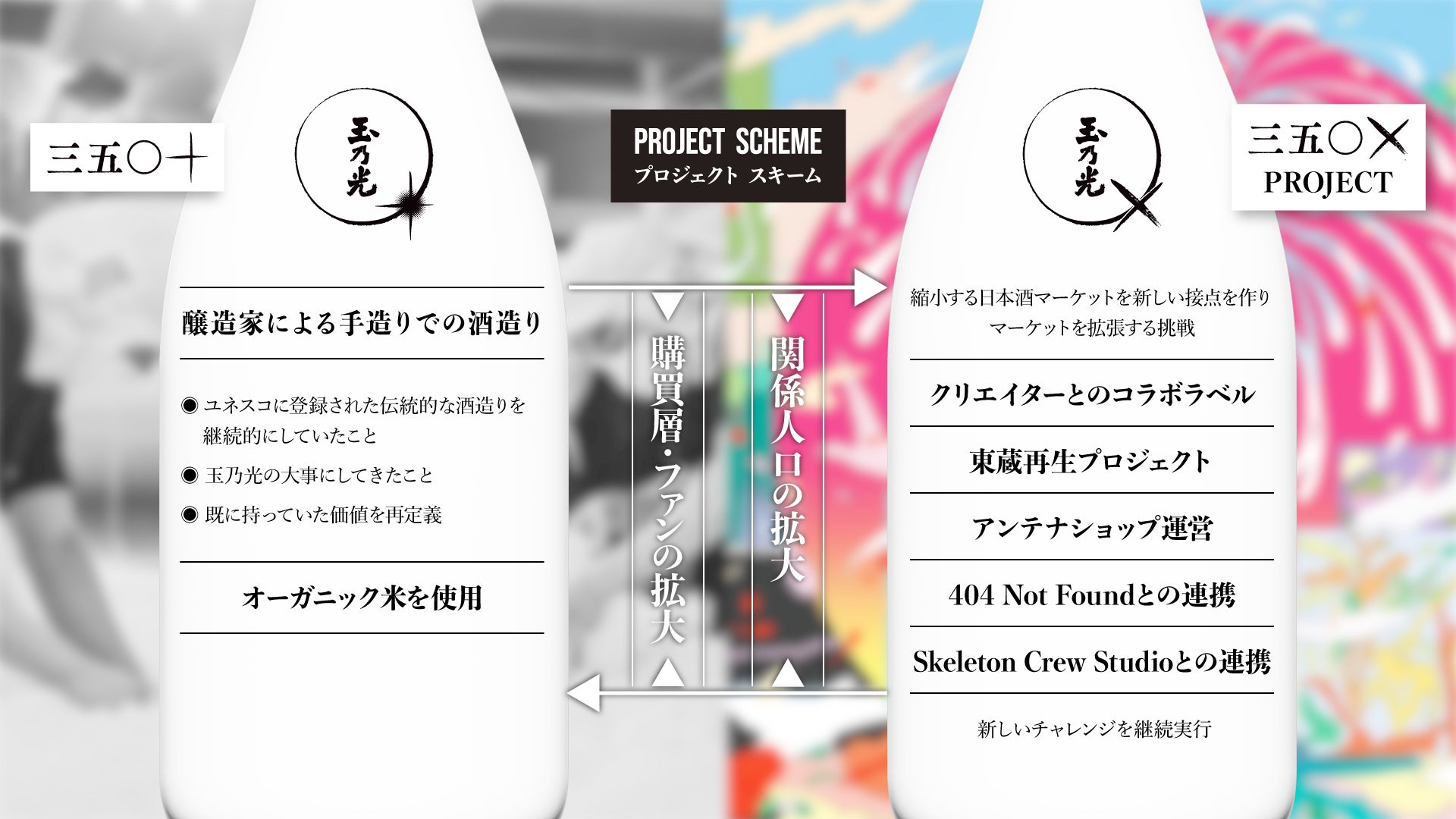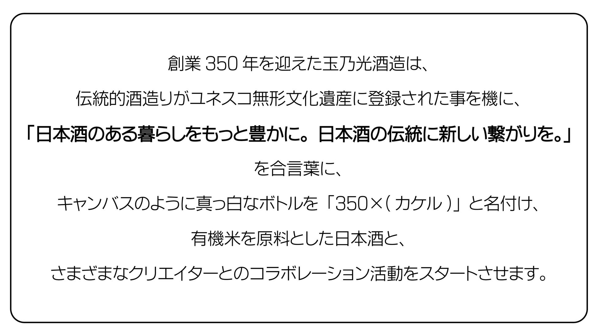代々受け継がれてきた「伝統的酒造り」はまさにクリエイティブであり、日本が世界に誇る様々なクリエイティブと重ね合わせることで、「伝統的酒造り」を価値ある産業として、未来に繋いでいきたいと思い、このプロジェクトを立ち上げました。創業350年を迎えた玉乃光酒造が、さまざまなクリエイティブと重ね合わせていくという意味を込めて、「350×プロジェクト」と名づけました。