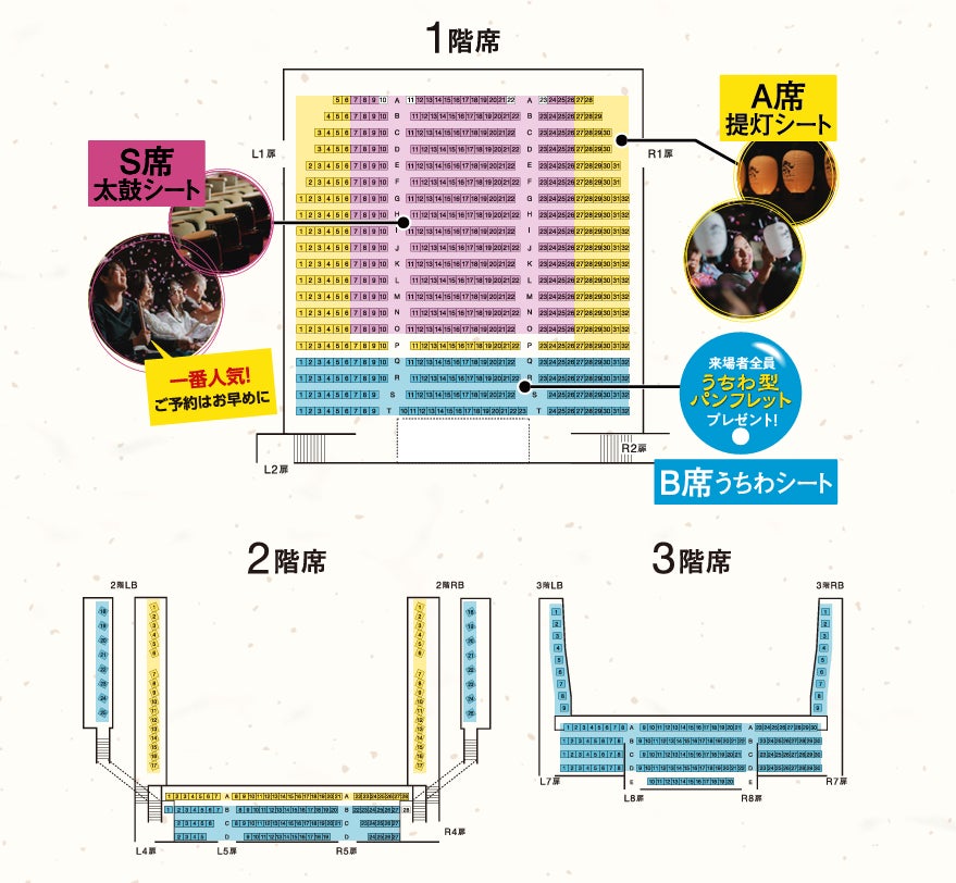 ※開演前に客席へご入場いただくようにご協力お願いいたします。上演中の途中入場の場合、特に太鼓シートはご予約の座席位置でご鑑賞できない場合がございます。あらかじめご了承ください。