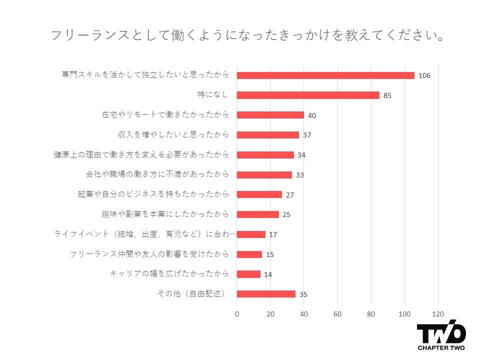 クリエイター育成スクールの株式会社Chapter Two(チャプターツー)では、現在フリーランスとして活躍している方に向けて「フリーランスになったきっかけ」に関するアンケート調査を行いました。