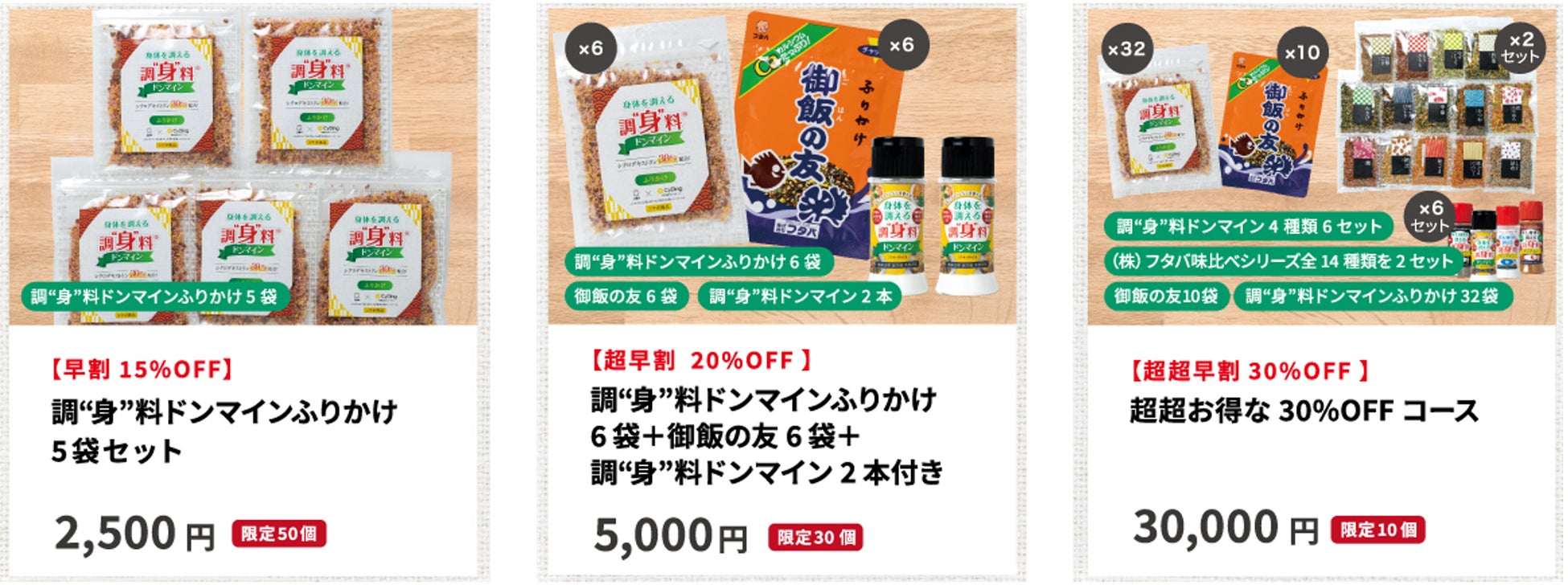 先行販売では、早割 (15%オフ)や超早割 (20%オフ)、超超早割 (30%オフ)などのお得な特別価格にて販売致します。また、リターン品には、調“身”料®︎「ドンマイン」の全シリーズやフタバ様よりご提供いただいた御飯の友・ふりかけ味くらべシリーズなど豊富に取り揃えています。