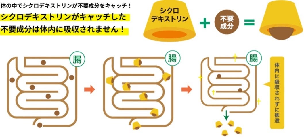 不要成分をキャッチするというユニークな特徴を有するため、医薬品添加物や日用品、化粧品などに応用されています。また、シクロデキストリンがキャッチした不要成分は、体内に吸収されることなく体外に排出されるため、サプリメントや健康食品にも利用されています。
