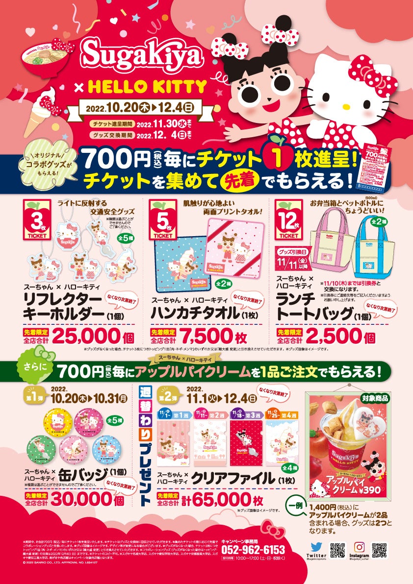 内容:スガキヤのキャラクター「スーちゃん」とサンリオのキャラクター「ハローキティ」がコラボした期間限定メニュー「アップルパイクリーム(税込390円)」や、お会計700円毎(※1)に進呈されるチケット(※2)を集めてもらえる限定コラボグッズ(リフレクターキーホルダー、ハンカチタオル、ランチトートバッグ)など(※3)が多数登場します。