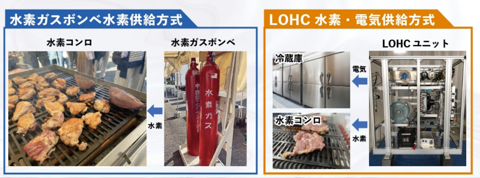 今回の展示では、フレイン・エナジーが開発した液体有機水素キャリア(LOHC)※を使用した水素発電ユニットによる水素・電気の供給方式と水素ガスボンベによる水素の供給方式をパネルでご紹介します。また、昨年9月に販売開始したH2&DXの事業用「水素コンロ」は、世界初の水素ガスを直接燃焼させて調理するコンロです。燃焼時に二酸化炭素を発生させないだけでなく、食材そのものの香りを楽しめ、外カリカリ、中ジューシーな焼き上がりとなる水素調理というまったく新たな調理手法の普及を目指しています。
