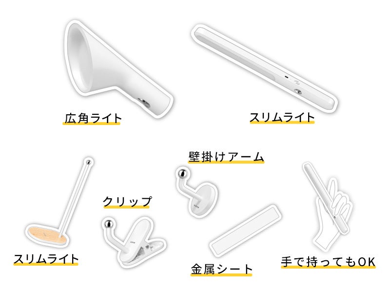 2つのライトヘッドと、4つのパーツを組み合わせ、9種類以上の使い方が楽しめます。例えば、スリムライトとライトスタンドを組み合わせてデスクライトに、広角ライトと壁掛けアームを組み合わせてウォールライトに、スリムライトと金属シートを組み合わせてクローゼットライトにするなど、ライトで気軽におしゃれな空間を楽しめます。