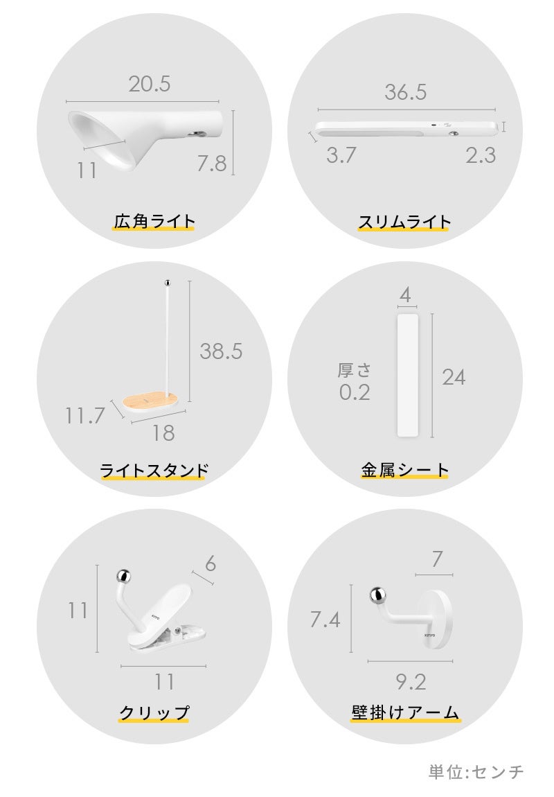 2つのライトヘッドと4つのパーツを組み合わせ、9種類以上の使い方を楽しめる便利なライトです。空間を節約利用、充電式で携帯可能、どこでも固定できるなど、一台あれば家中の照明を解決できるように設計されています。読書、料理、美容、アウトドア、車内、緊急時など、あらゆるシーンの照明ニーズに一度に応えます。