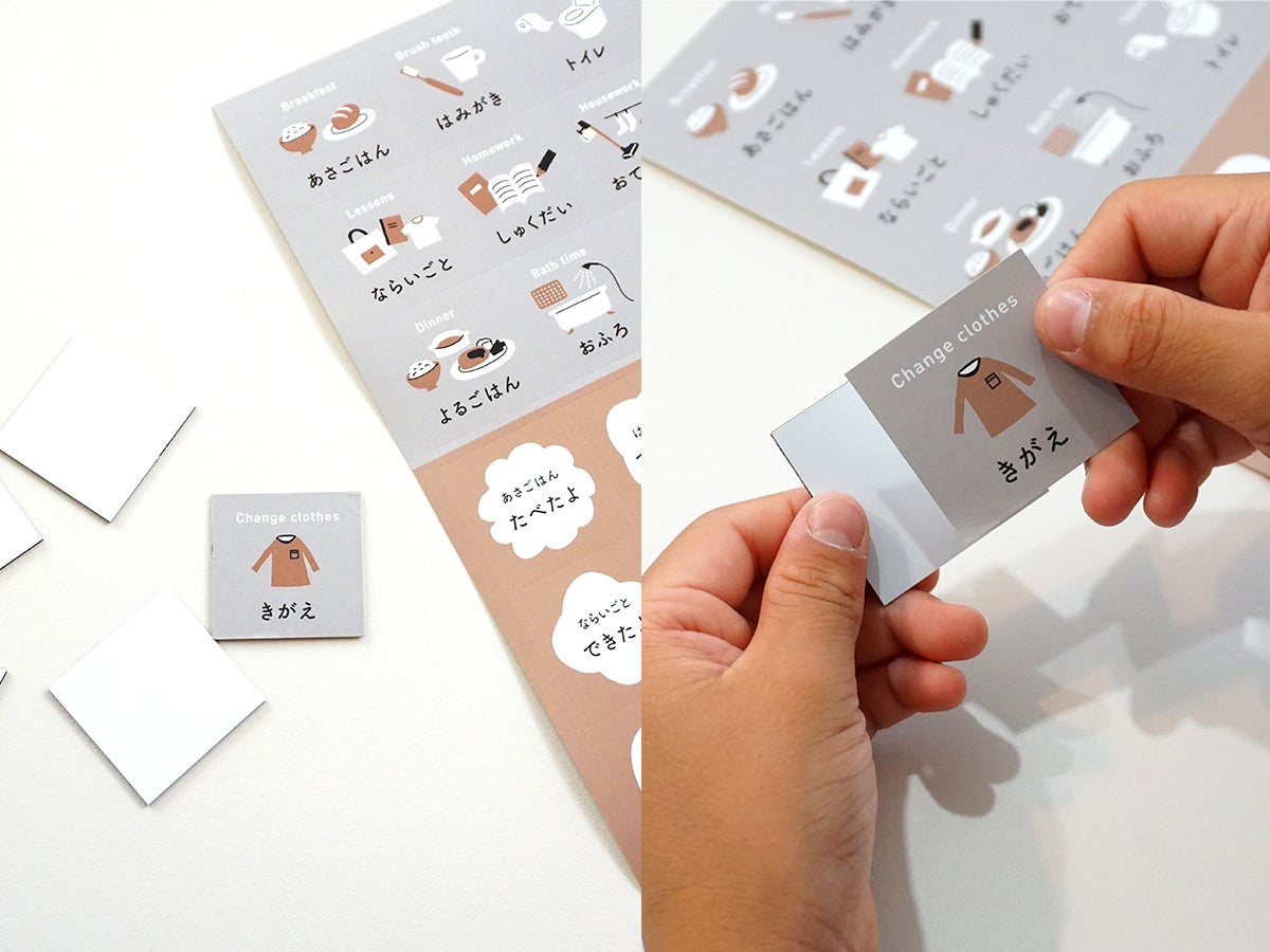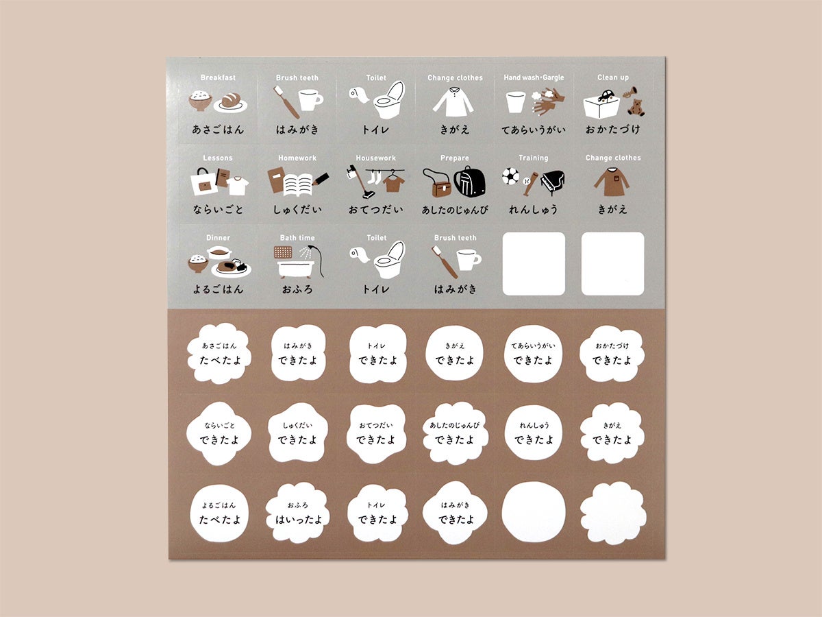 「てあらいうがい」「あしたのじゅんび」「しゅくだい」などをイラストとひらがなで表したTO DOシールは、全部で16種類。それぞれ「できたよ」シールとセットになっています。ライフスタイルに合わせて、12枚のマグネットシートの表裏に必要なTO DOを選んで貼り付けます。また、空白のシールも2セット付いているのでオリジナルのTO DOを自作することも可能です。