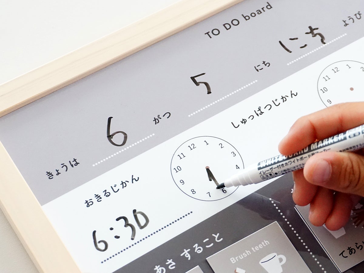 子どもの毎日のTO DO(すべきこと・やること)や身支度がスムーズになる「お支度ボード」。TO DOがひと目で分かるから、親子で1日の流れを確認するのにとっても便利。子どもが自発的に行動することをサポートできるアイテムです。取扱いやすく間違えても簡単に消せる全面ホワイトボード仕様。付属のペンで日付や曜日を書き込んでお使いください。