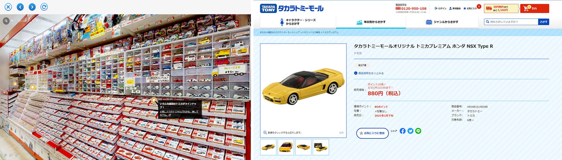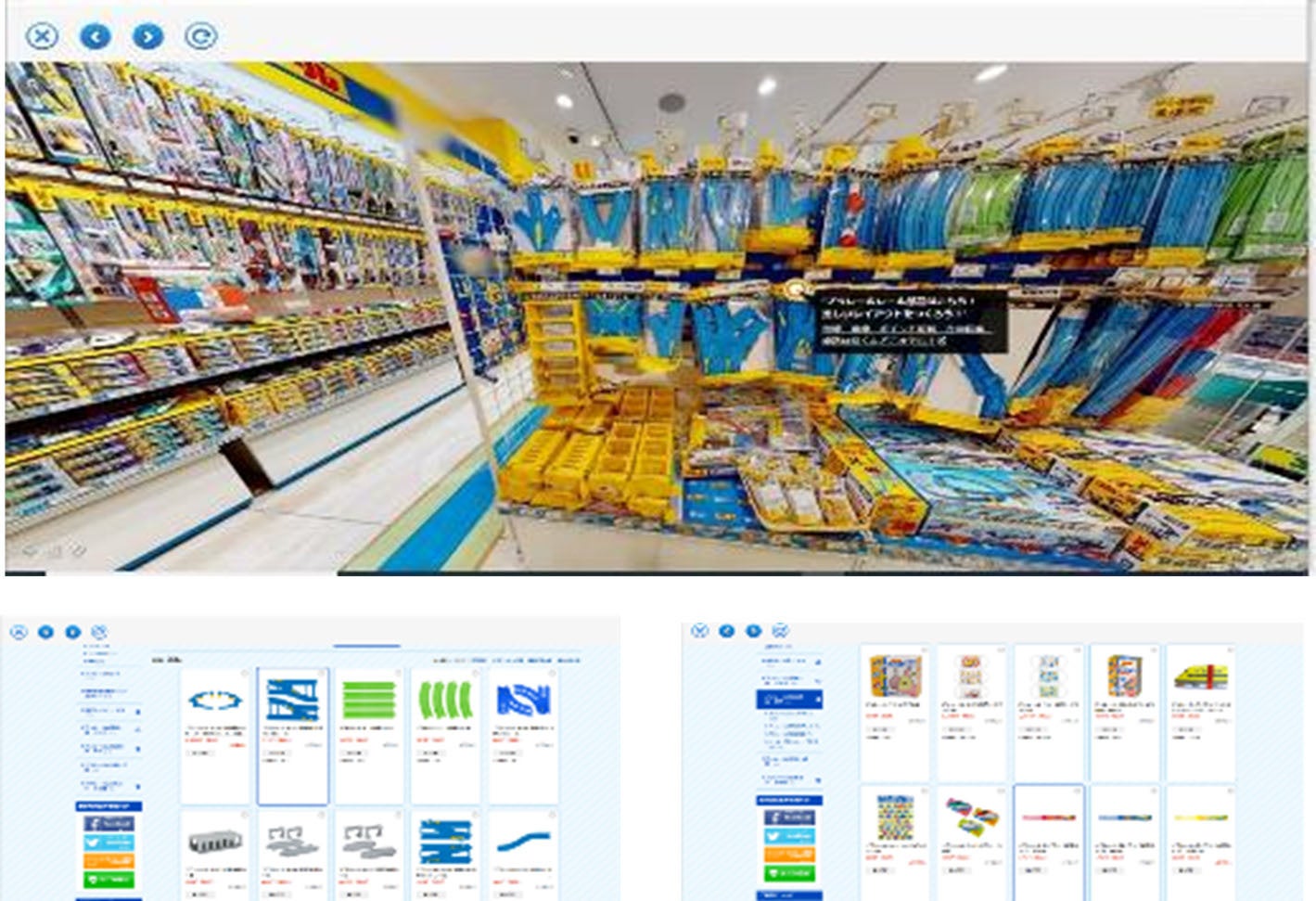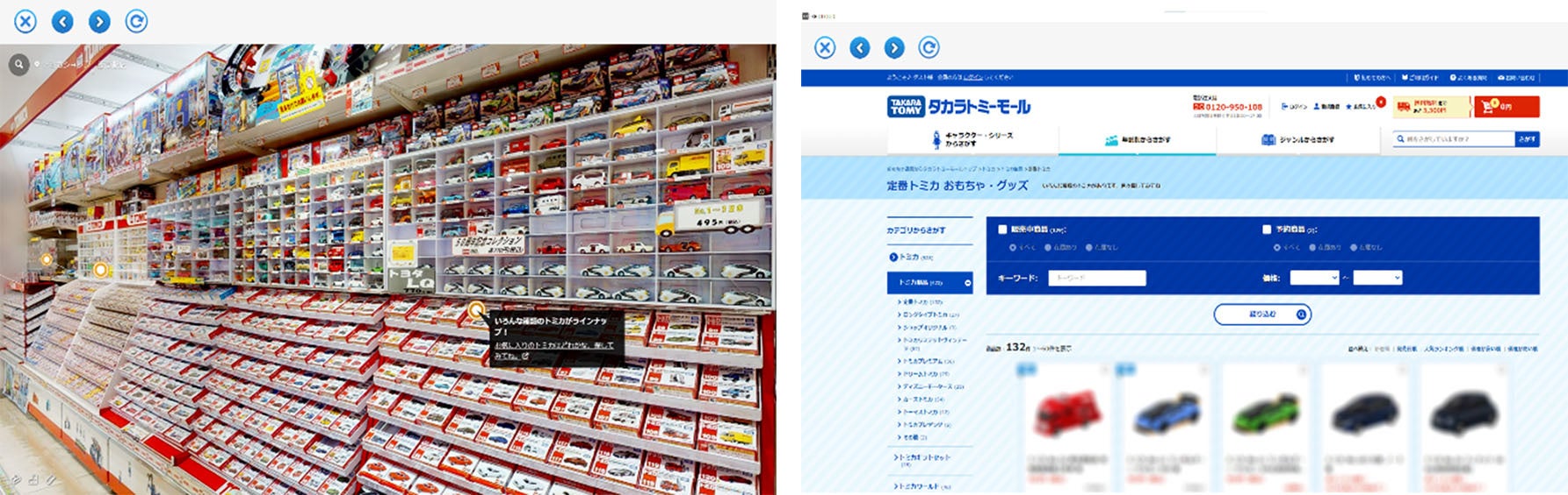 実際にある「トミカ・プラレールショップ」の店舗を360度カメラで撮影した4Kの高画質な画像のデータによるショップになります。実際の店内を歩いているように回遊することが出来ます。