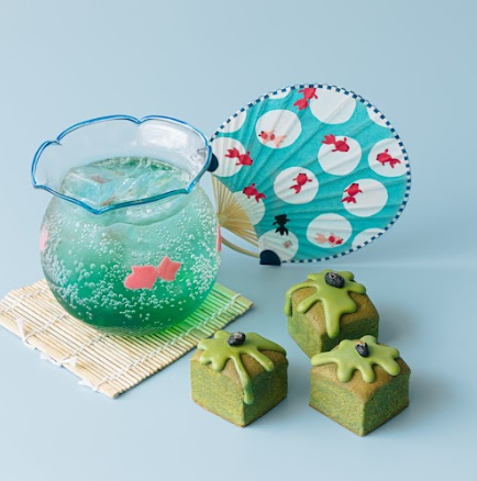 「金魚ソーダ 」は、ラムネソーダを白玉粉で作った金魚入れた、爽やかな甘さのドリンク。まるで金魚すくいのように、金魚鉢からすくって食べる楽しさを味わえる、かわいくて楽しい期間限定メニューです。