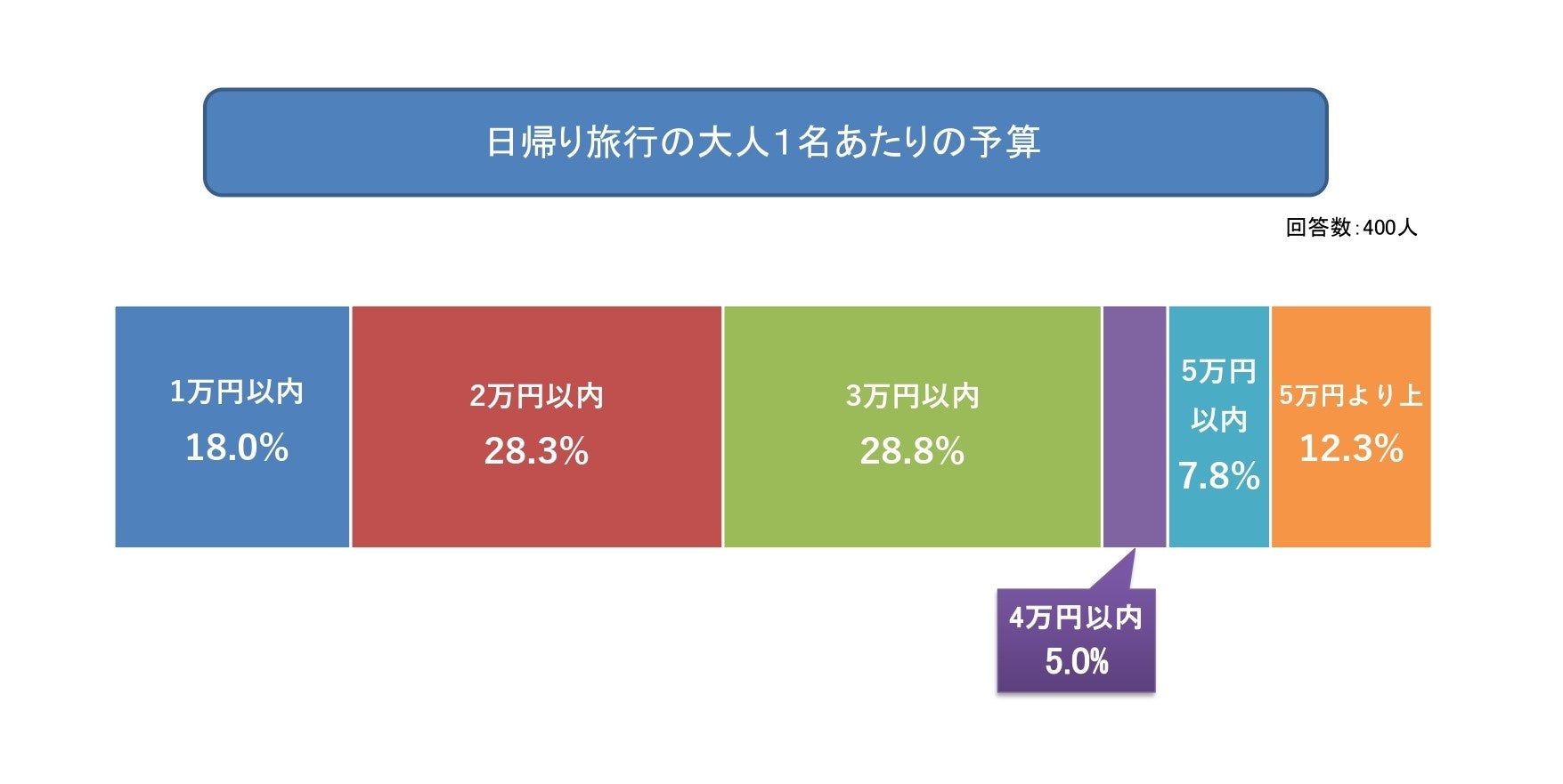 日帰り旅行の予算は、3万円以内が28.8%と最も多い結果となりました。また、「3万円以上」の合計は25.1%という結果となり、日帰り旅行市場においても高付加価値を提供する機会がある事がうかがえます。