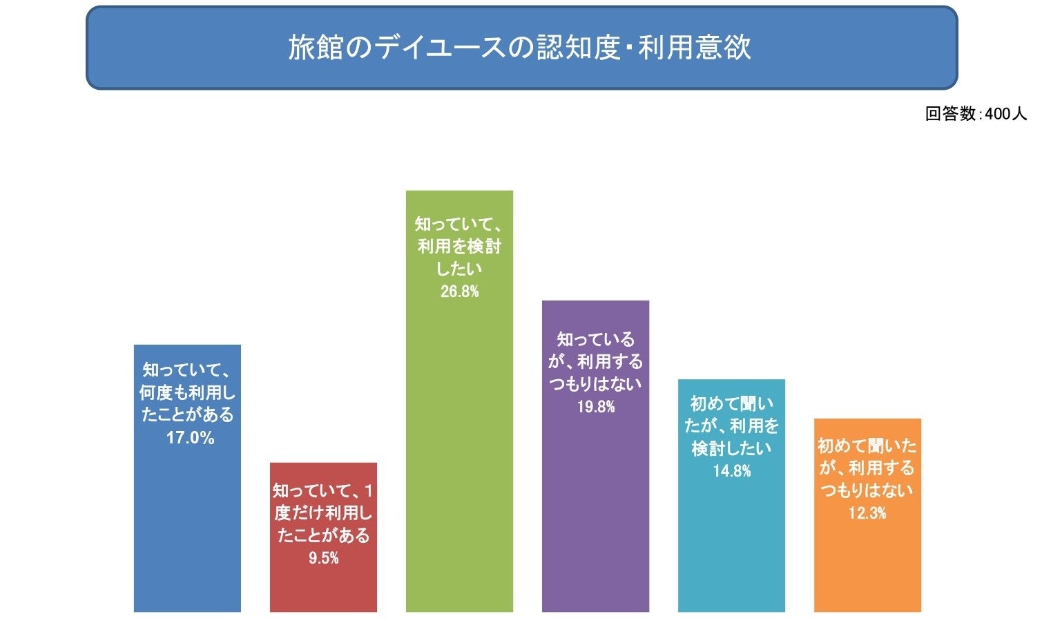 今回の「日帰り旅行」と「デイユース」に関する調査では、新型コロナウイルスの行動制限の緩和前と比べ、36.8%が「現在の日帰り旅行への意欲が増した」と回答しており、「旅館のデイユースを利用したことがある・検討したい」は68%を超える結果となりました。また、65.3%が「日帰り旅行で県民割や都民割を積極的に活用する」と回答していることなどから、今後のデイユース市場の発展に期待を持てる結果となりました。