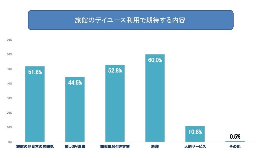 旅館のデイユースに期待する内容(複数回答可)は、「料理」が60%とトップの結果となりました。次に「露天風呂付き客室」52.8%、「非日常の雰囲気」51.8%と期待が高く、日帰りでもプライベートな空間で温泉をゆっくり楽しみたい傾向が見受けられます。一方に「人的サービス」への期待度が10.8%にとどまり、旅館のデイユースに期待される内容としては、料理や施設・設備への期待値が高い結果となりました。