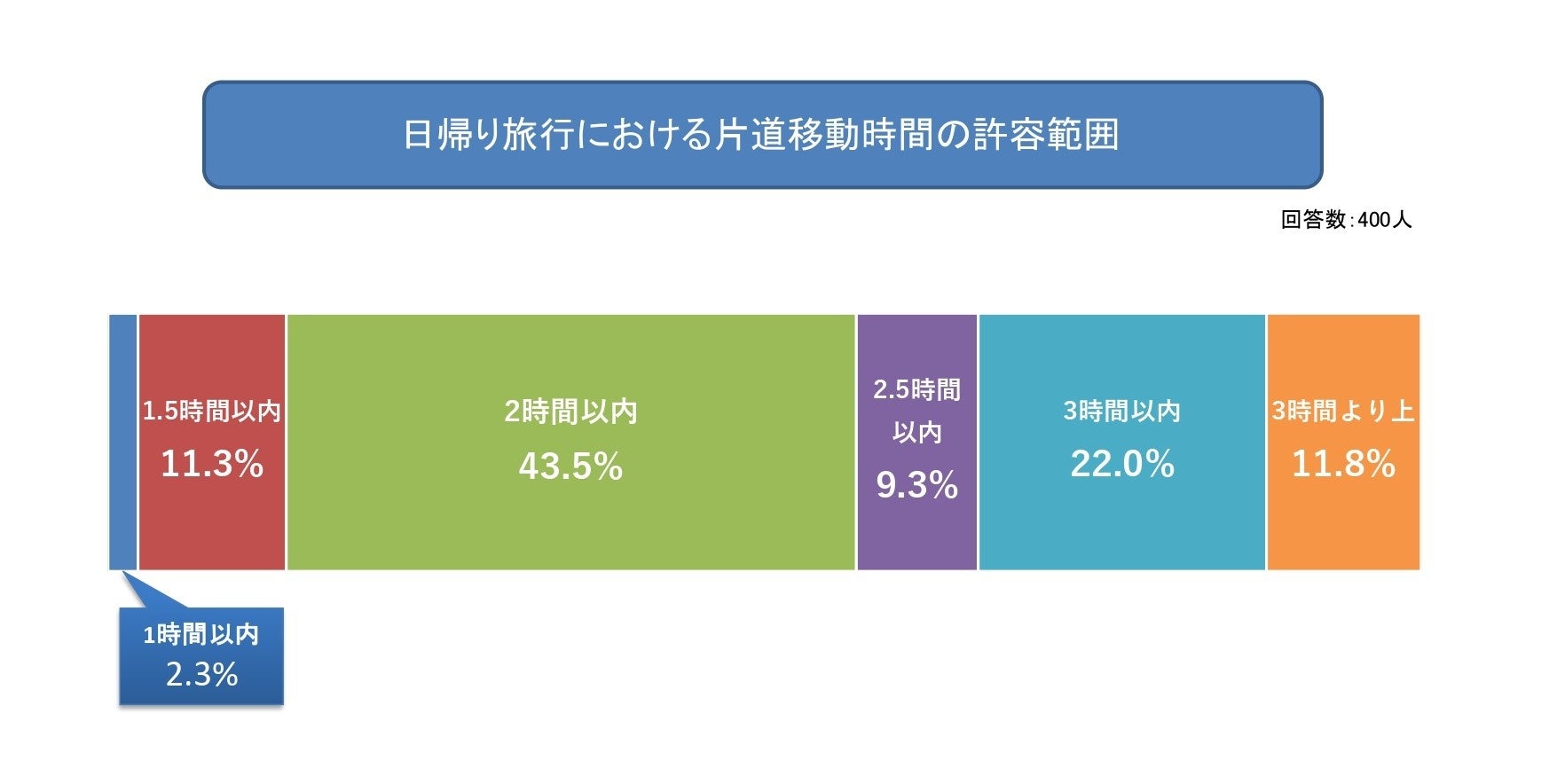 日帰り旅行における片道移動時間の許容範囲は2時間以内の43.5%が最も多い結果となり、1時間以内~2時間以内の合計は57.1%となりました。