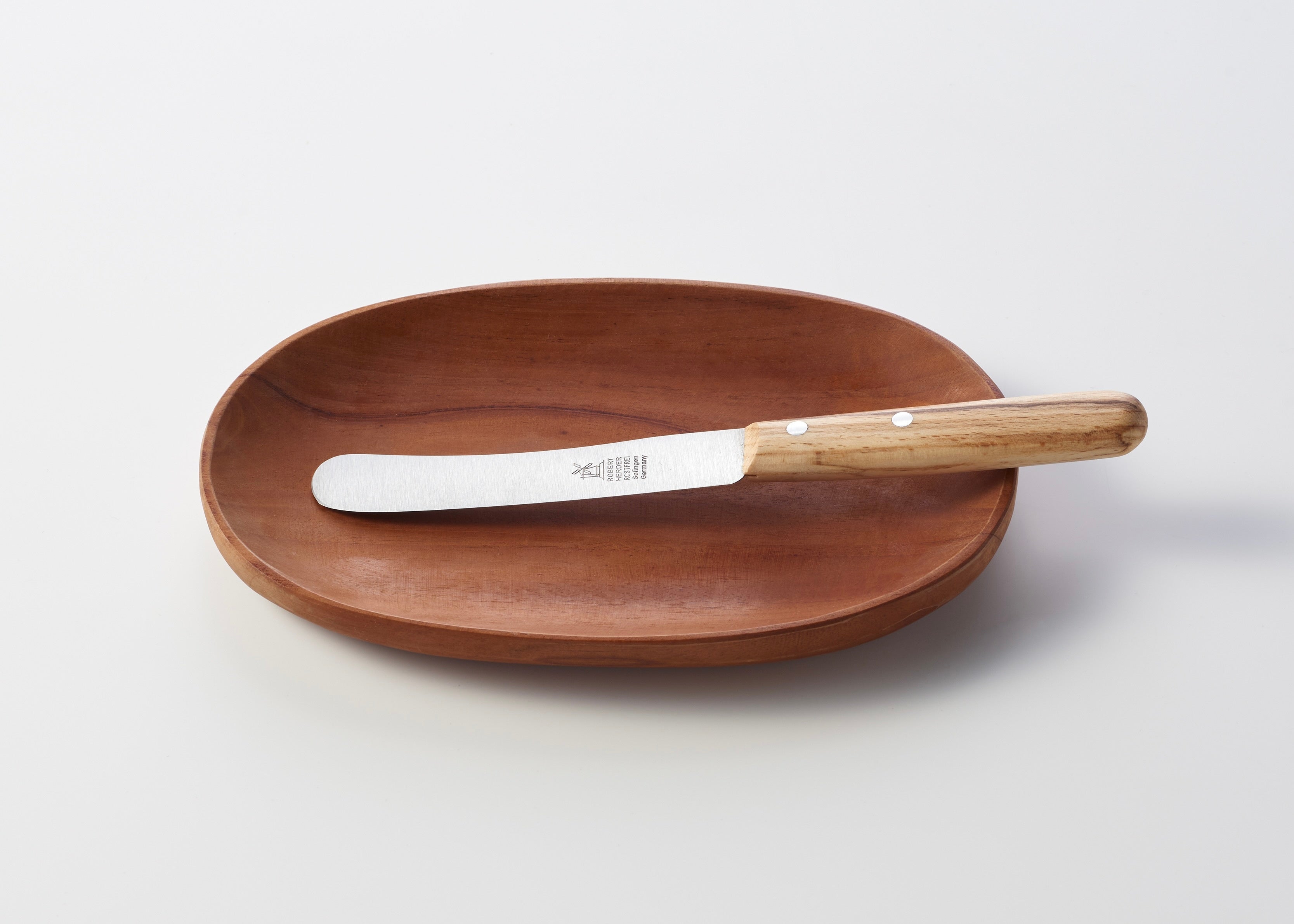 今回グッドデザイン賞を受賞した 「オールドジャーマンナイフ」 も、ゾーリンゲン地方の伝統的な技術によって研磨された刃を採用し、職人の熟練の技によってひとつひとつ手作業で製造されたものです。 「オールドジャーマンナイフ」 の形状は、ゾーリンゲンにおける最も古いナイフと同じ形状をしており、見た目からは想像できない鋭い切れ味は、チーズや野菜、果物はもちろん、バゲットも力を入れずにカットすることができます。また、丸みを帯びた先端を活かしてジャムヘラやバターナイフとしてもご活用いただけます。良質な天然木で作られた持ち手は、握りやすさも考慮された設計が魅力のひとつです。