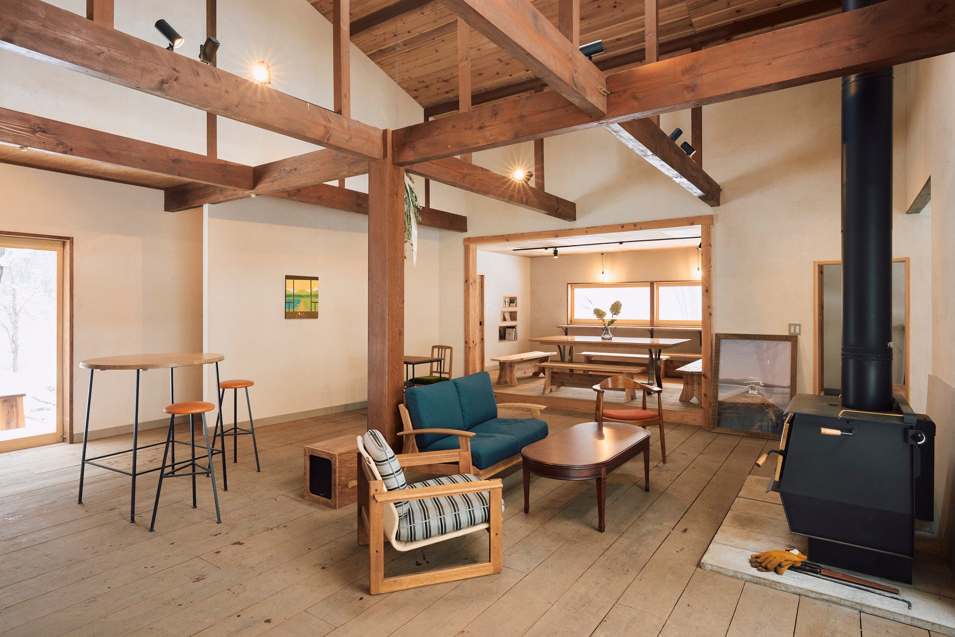 備品:全室床暖房、ダイニングキッチン、冷蔵庫、調理器具、ハンドドリップセット、シングルベット×4、ソファー、テーブル、Bluetoothスピーカー、焚き火台