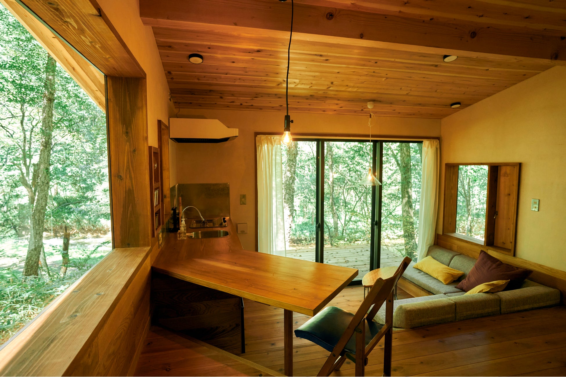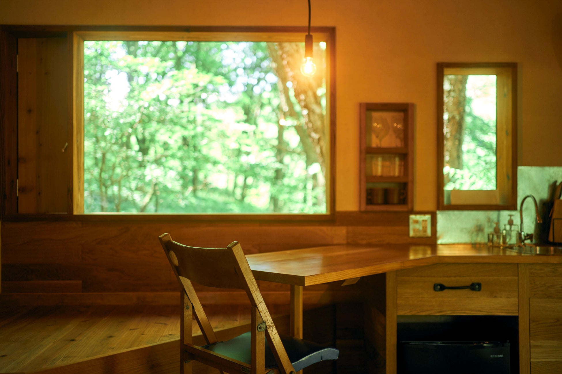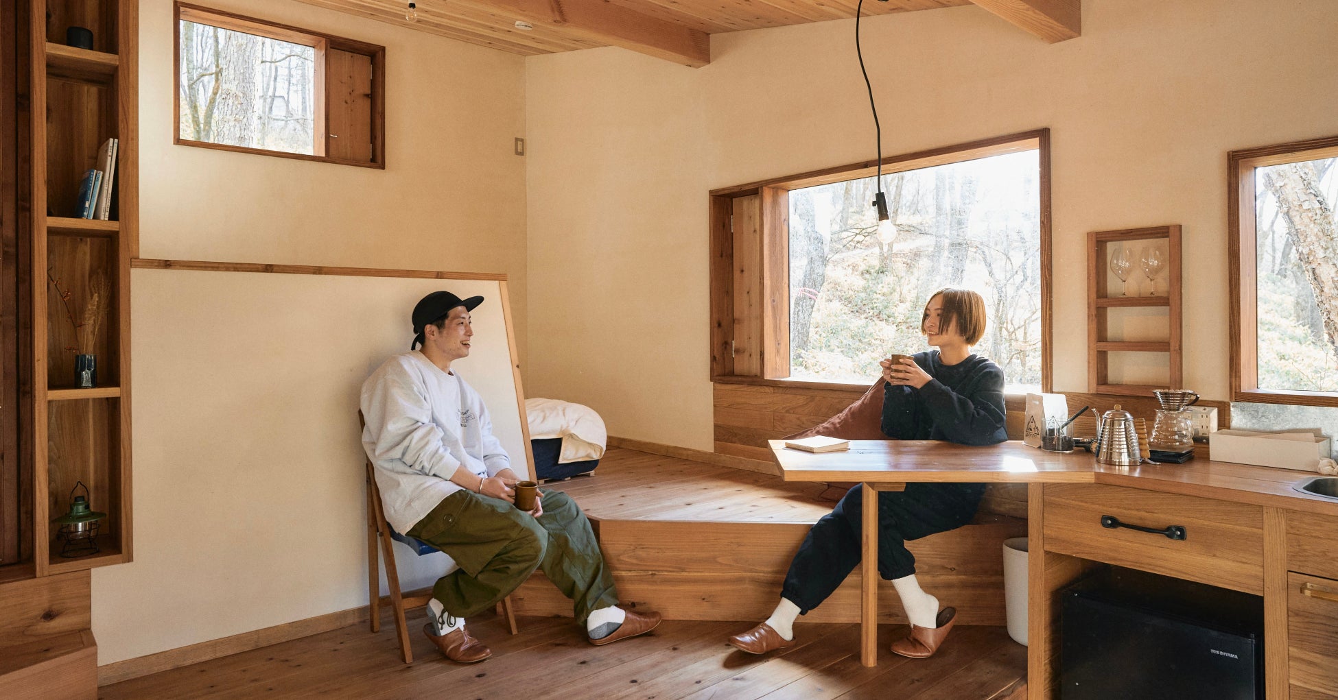 地形や風景に合わせて建てられたHutの窓は、青々とした木々や小鳥がさえずる川辺など、外の景色を美しく切り取ります。自然が織りなす風景や季節の移り変わりをお楽しみください。