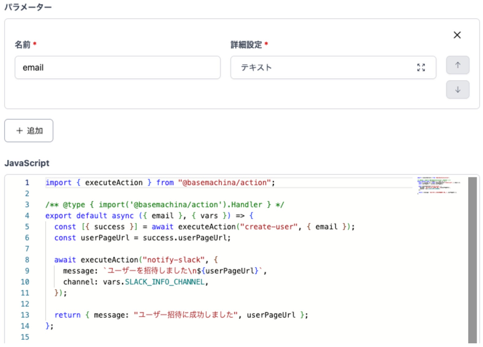 「JavaScriptアクション」は任意のJavaScriptをサーバー上で実行できる機能です。