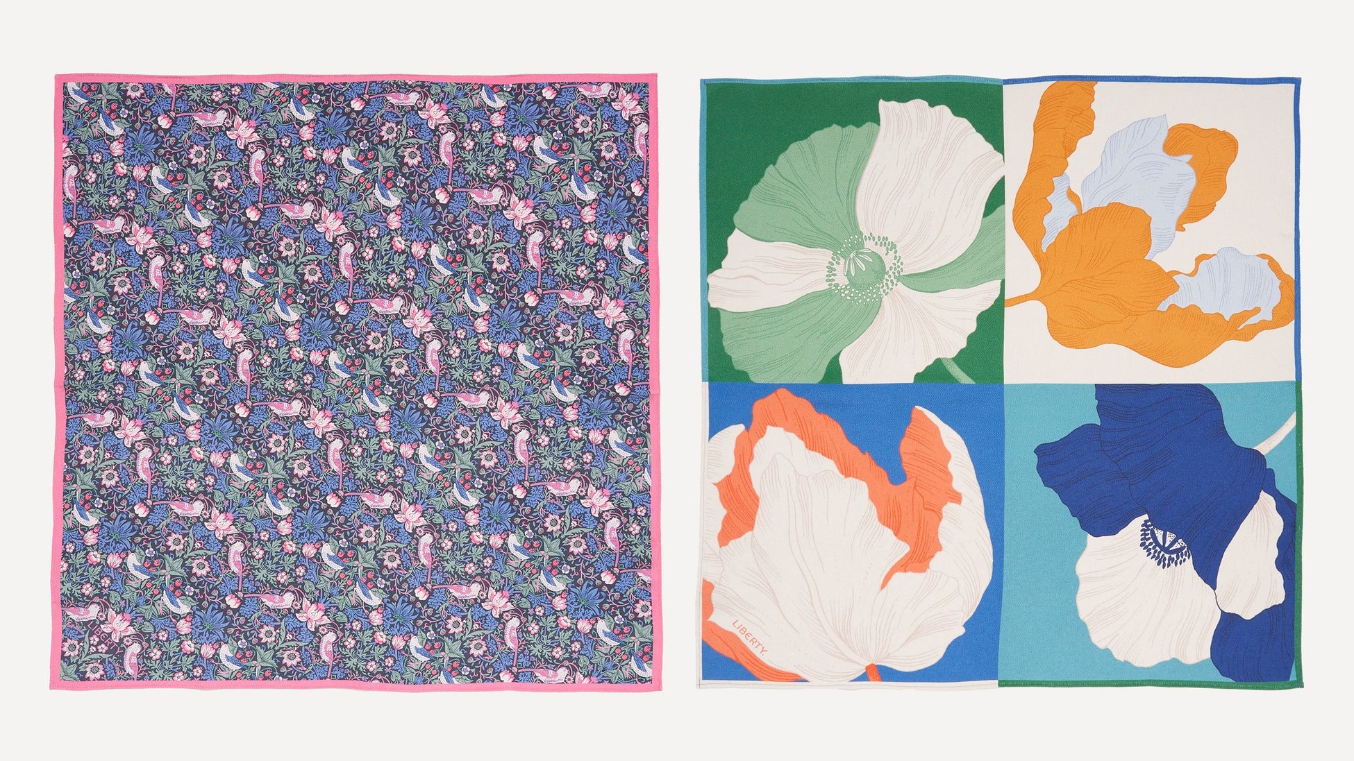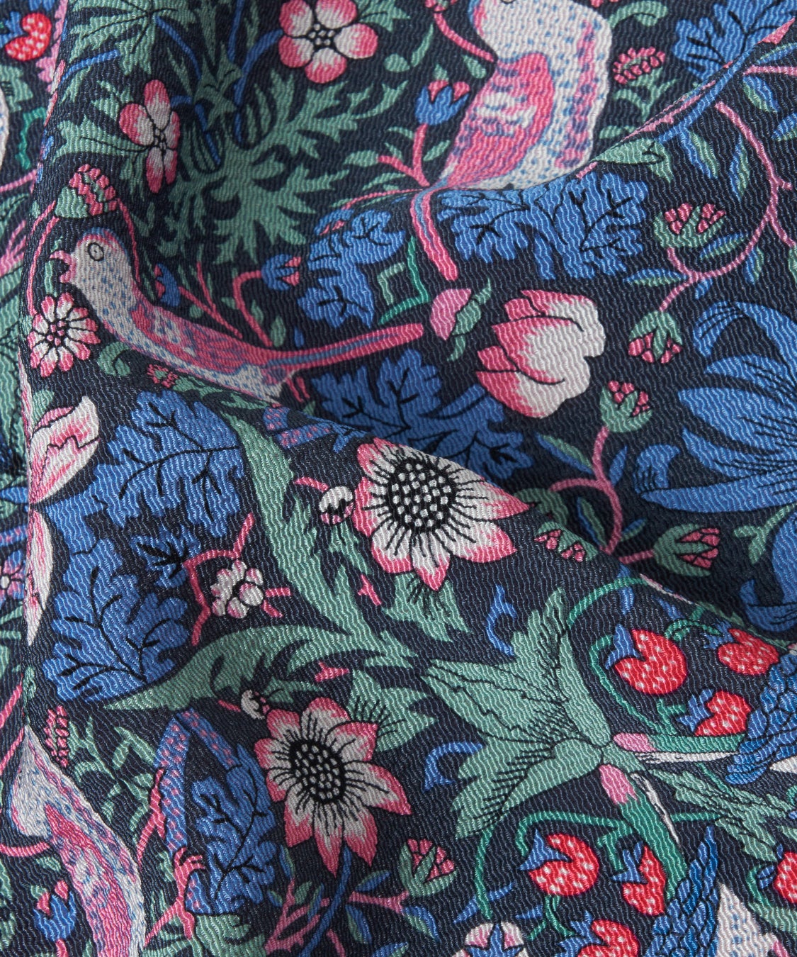 風呂敷に採用した2つのデザインは、いずれもリバティの代表的なプリントです。ひとつはウィリアム・モリスによる名作《ストロベリー・シーフ》、もうひとつは2025年の新作《フローラル・ミューズ》です。これらのデザインは、リバティのシルクスカーフの製造にも用いられる両面デジタルプリント技術を使って印刷されています。