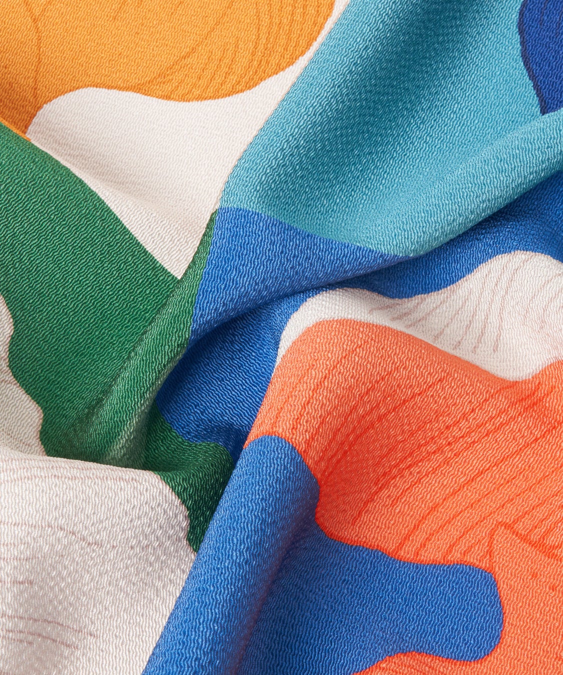 本コレクションの風呂敷は、リバティのクラシックなシルクスカーフを彷彿とさせ、使用する人それぞれが個性的なスタイルで楽しめるように仕上げられています。丸仙の丹後ちりめんの特徴は強い撚りを加えた緯糸が生み出す生地表面の凹凸、「しぼ」。しぼによってふくらみを増した絹は、小物、洋服、インテリア小物、寝具などの製品になることで様々な表情を見せます。また、強い撚りを加えたヘビーウェイトな丹後ちりめんは発色がよく深みがあり、色柄をより鮮やかに魅せてくれます。丸仙の丹後ちりめんは、リバティプリントを再現するのに適した素材でした。