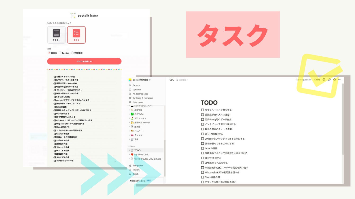 さらに、会議が終わった後も「postalk letter」を使用して議事録やタスクの作成を簡単に行うことができます。これにより、会議前から会議後まで、全てのプロセスがデジタル化され、より効率的なコミュニケーションとタスク管理が可能になります。