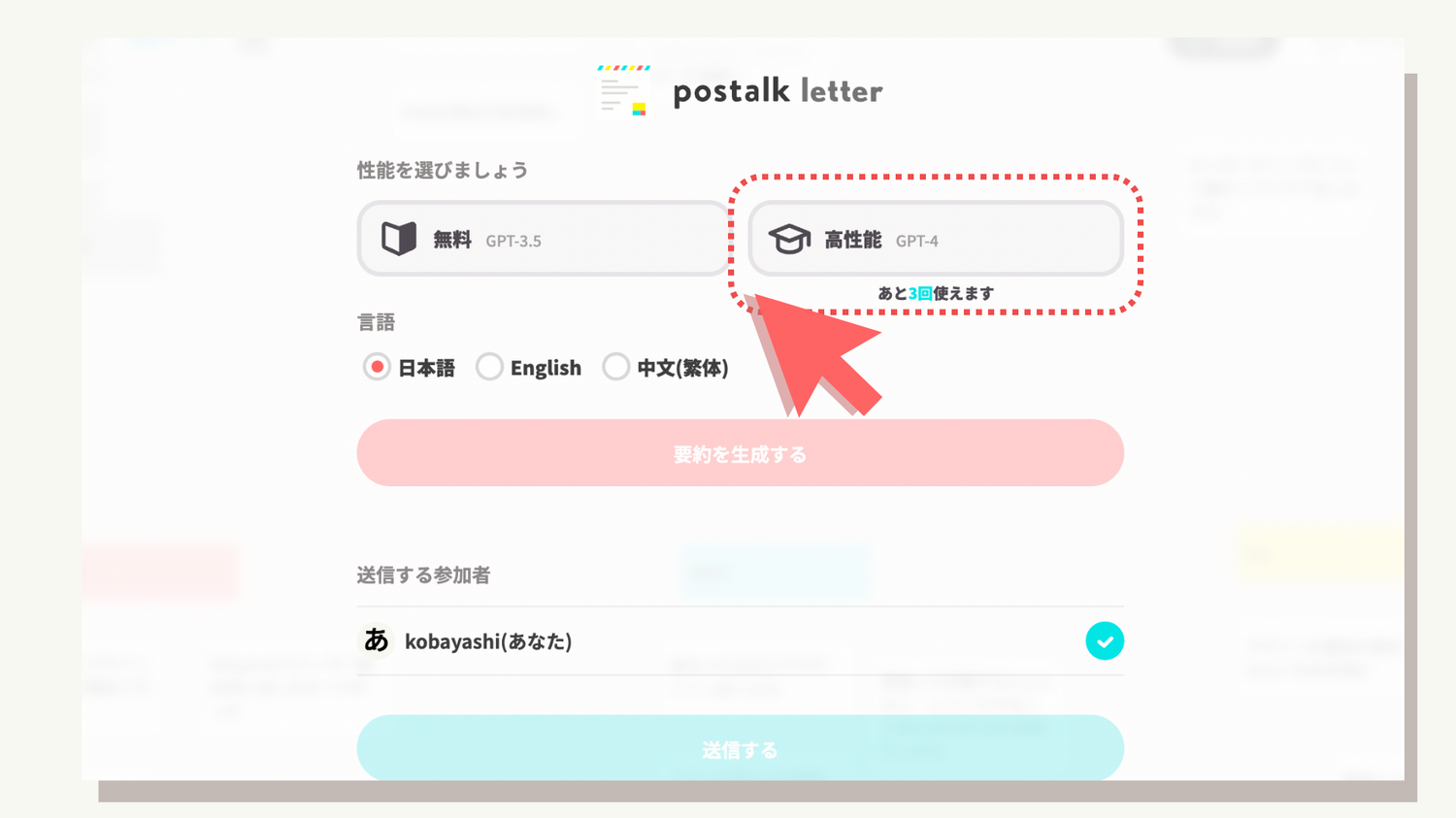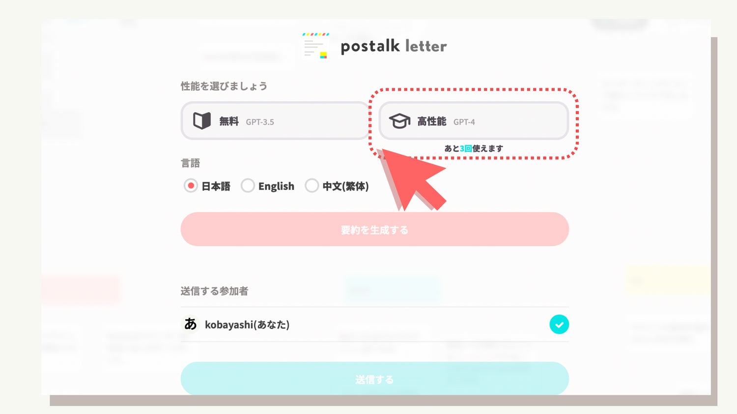 「無料 GPT-3.5」と「高性能 GPT-4」からお選びいただけます。なお、高性能は3回までご利用できます。