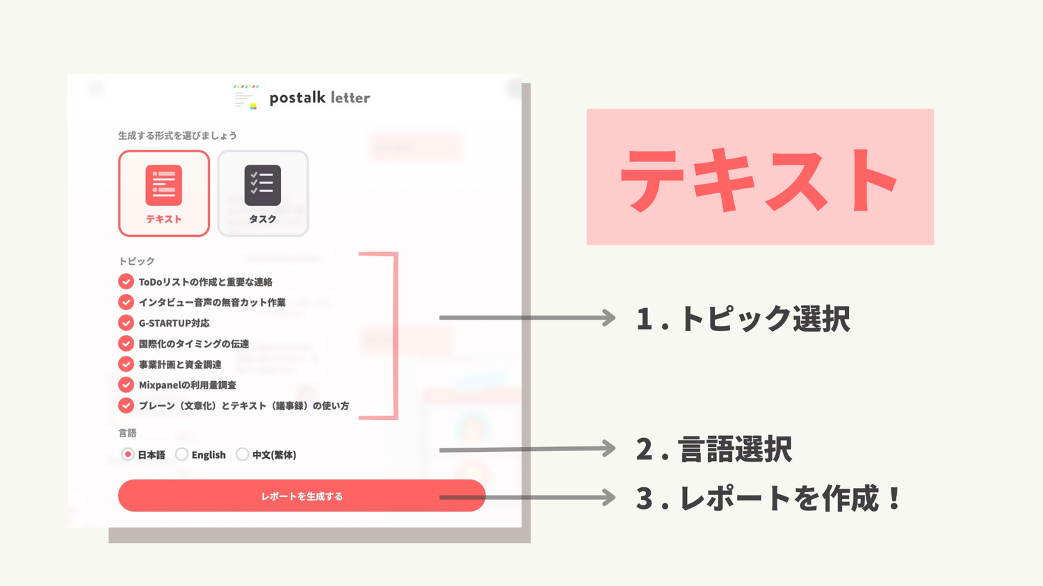 postalk letterは、会議中にホワイトボードに書かれた内容を基に、議事録やタスクを簡単に作成できます。生成する内容はユーザーが自由に選択可能で、その選択肢としては、ChatGPT3.5またはChatGPT4を利用した自動生成が含まれます。