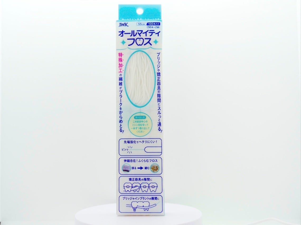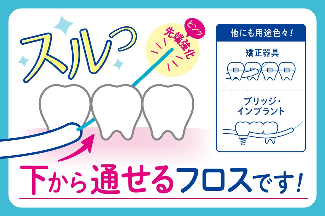 スーパーフロスは、通常のデンタルフロスの使いにくさを改善した新しいタイプのフロスです。通常のフロスは歯の上からしか通せませんが、スーパーフロスは先端が強化されており、針のように歯や矯正器具の下を通すことができるため、いままで磨けなかった場所の掃除を行うこともできます。また特別な加工により、歯間の細かい隙間にも対応して効果的にプラークを除去します。