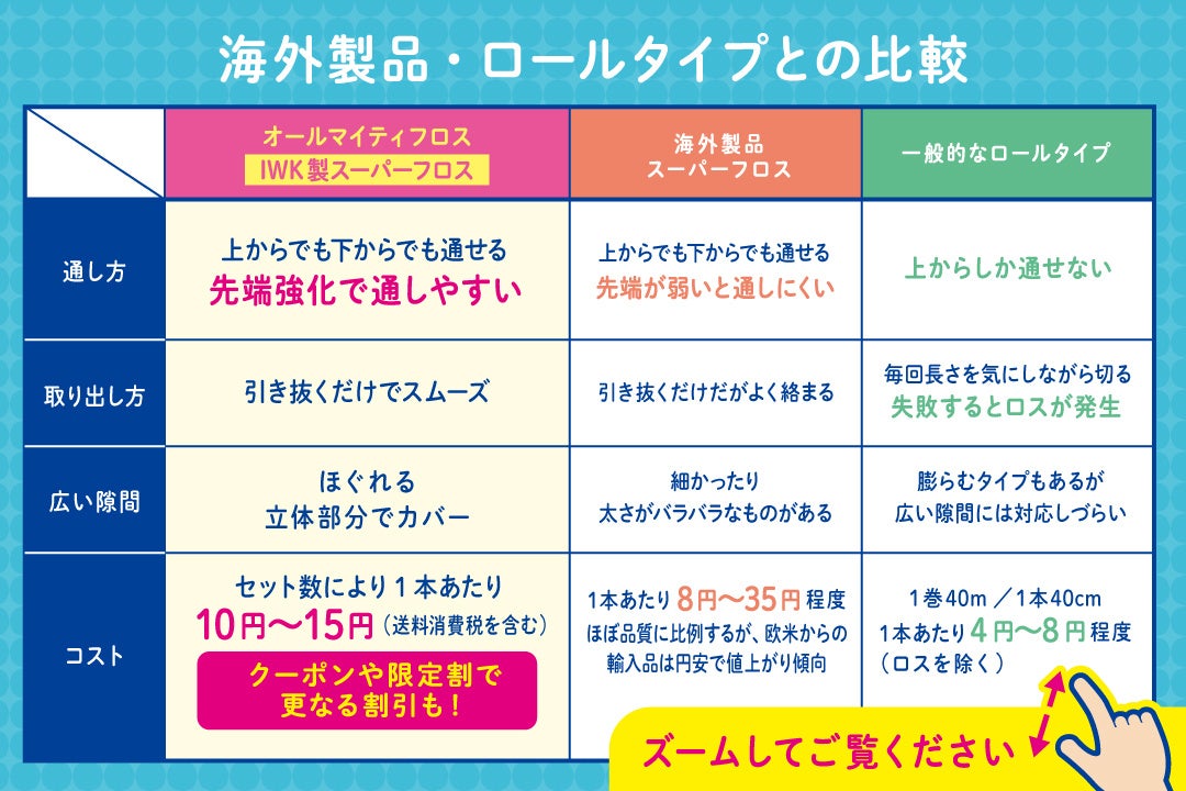 特殊加工: フロスの品質にこだわり様々な隙間に対応。