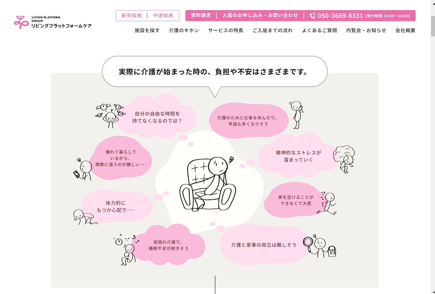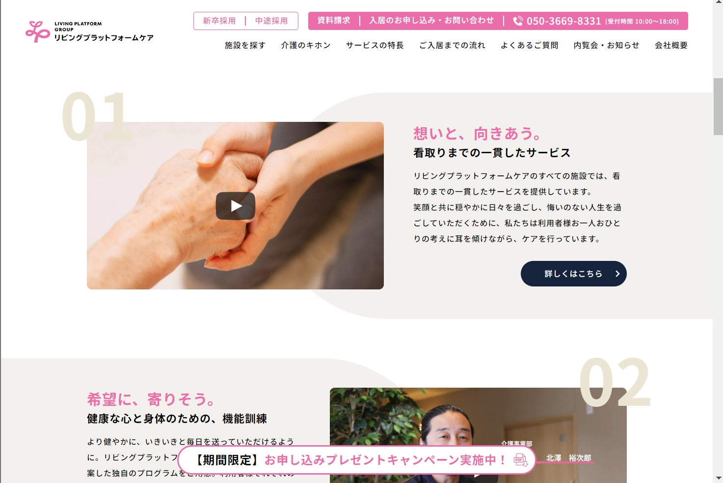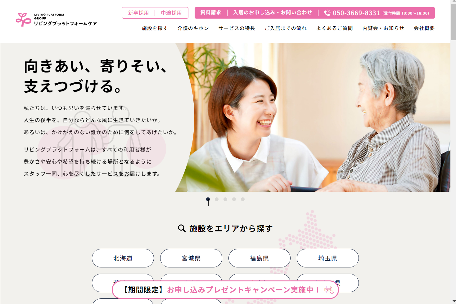 全国で有料老人ホーム、グループホーム等の高齢者向け介護サービスを運営する株式会社リビングプラットフォームケア(本社:北海道札幌市、代表取締役:金子洋文)は、同社のサービスおよび施設紹介のウェブサイトをリリースいたしました。