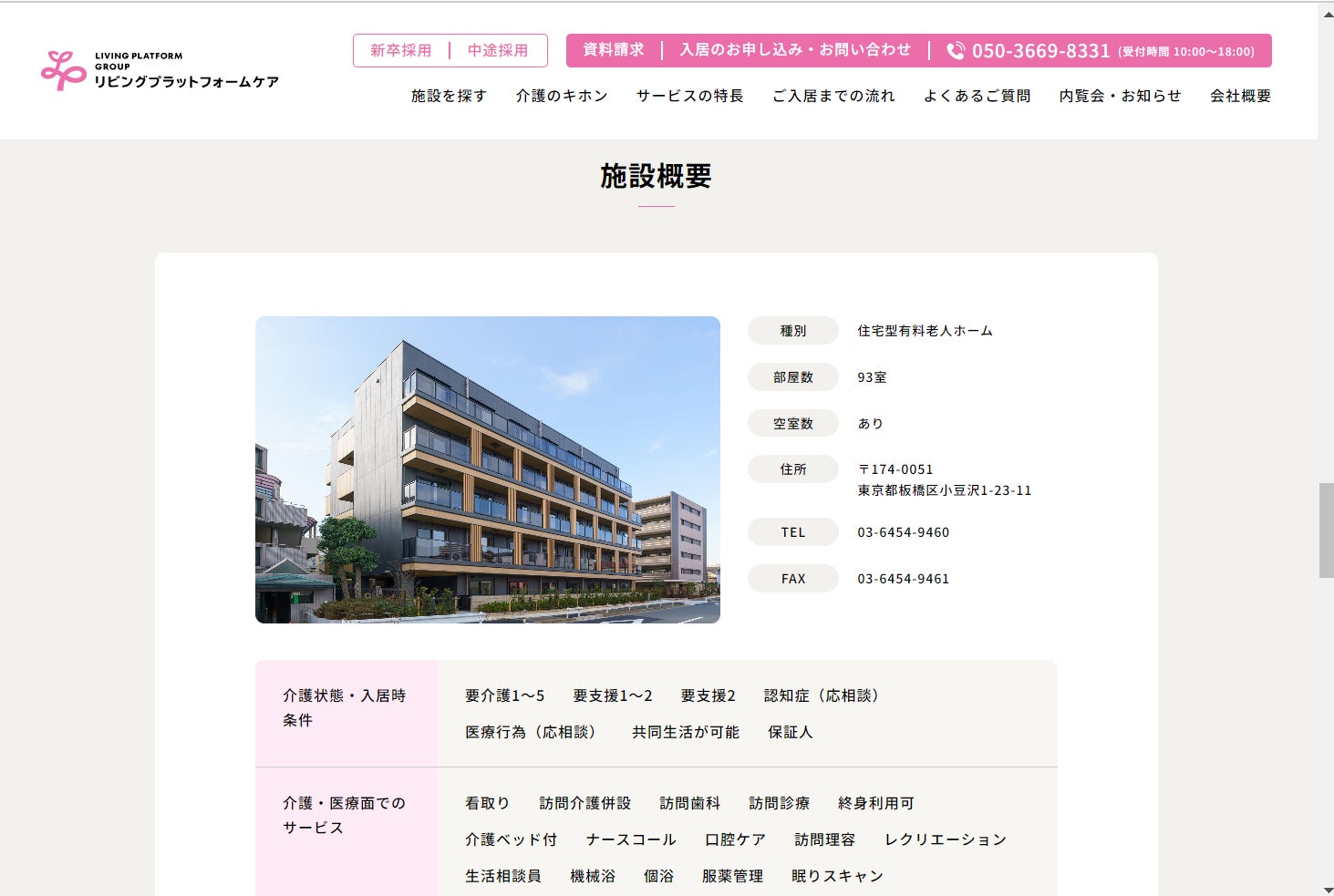https://care.living-platform.com/facility/50 (施設ページの一例)