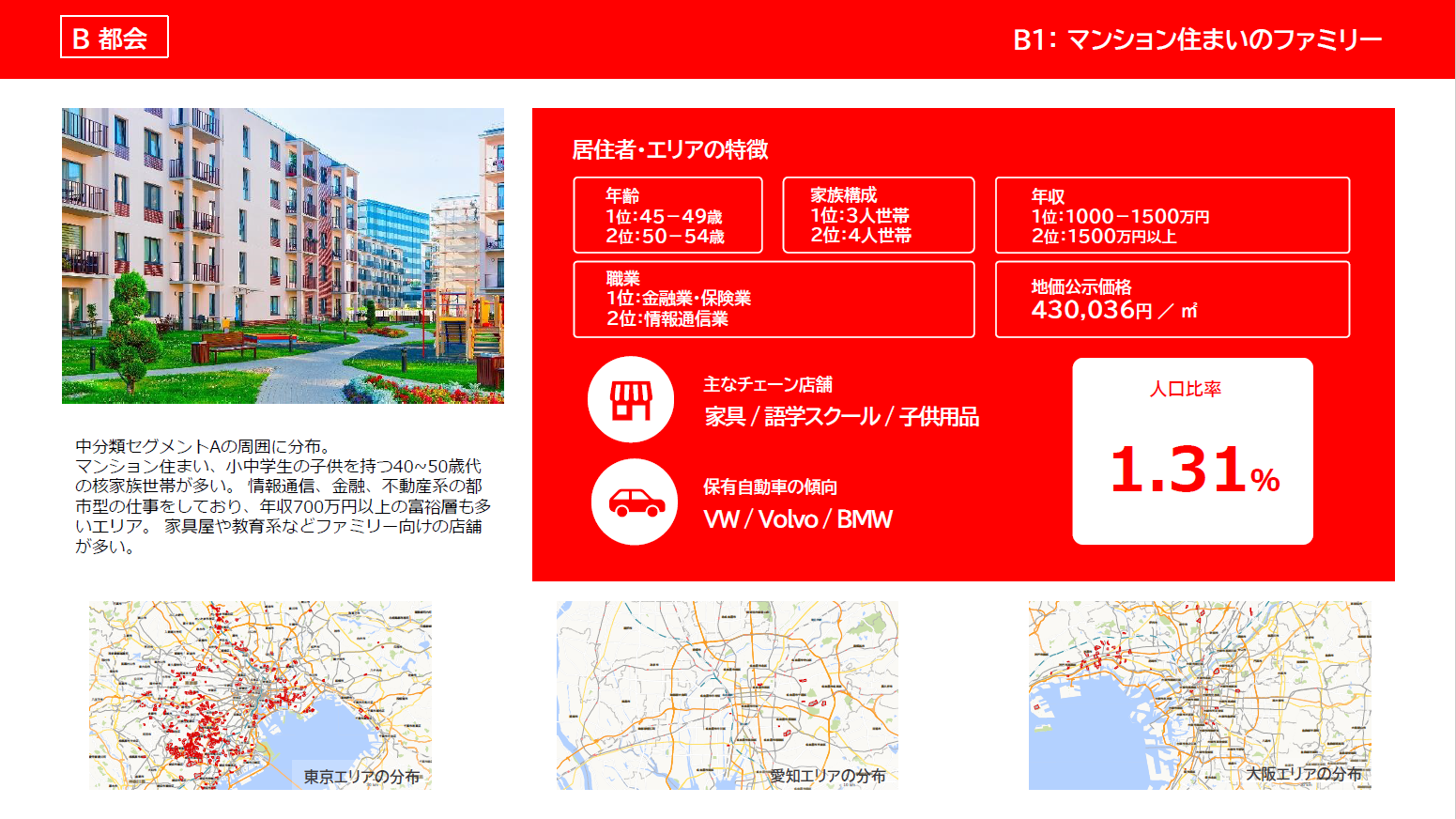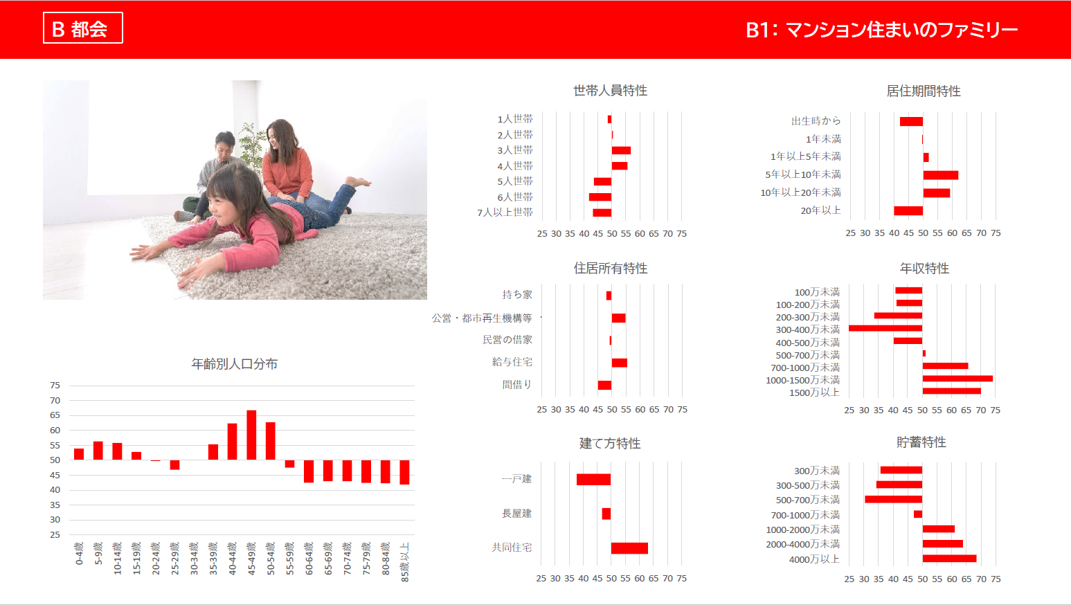 年齢や家族構成、住宅、職業等の特性に「年収」や「地価」も加味した独自の分類技術でクラスタリングした