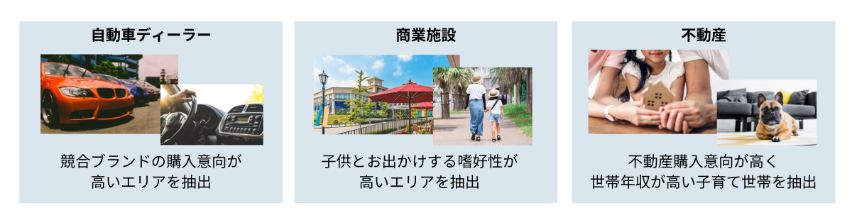 自動車の保有傾向や、消費傾向、チェーン店の出店傾向等がエリアごとに分かる「c-japan®」や各種統計データの組み合わせにより、業種ごとの広告配信ニーズに沿ったプランニングを支援します。