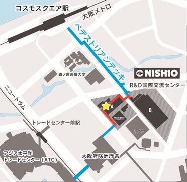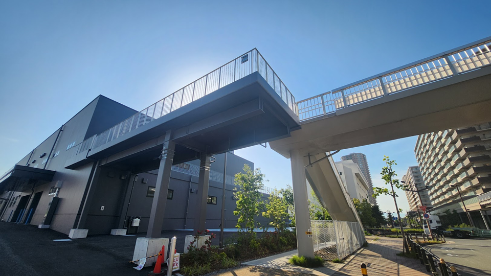 今回掲出を行うペデストリアンデッキは大阪メトロ中央線コスモスクエア駅から大阪府咲州庁舎、アジア太平洋トレードセンター(ATC)までを繋ぐ歩行者デッキ