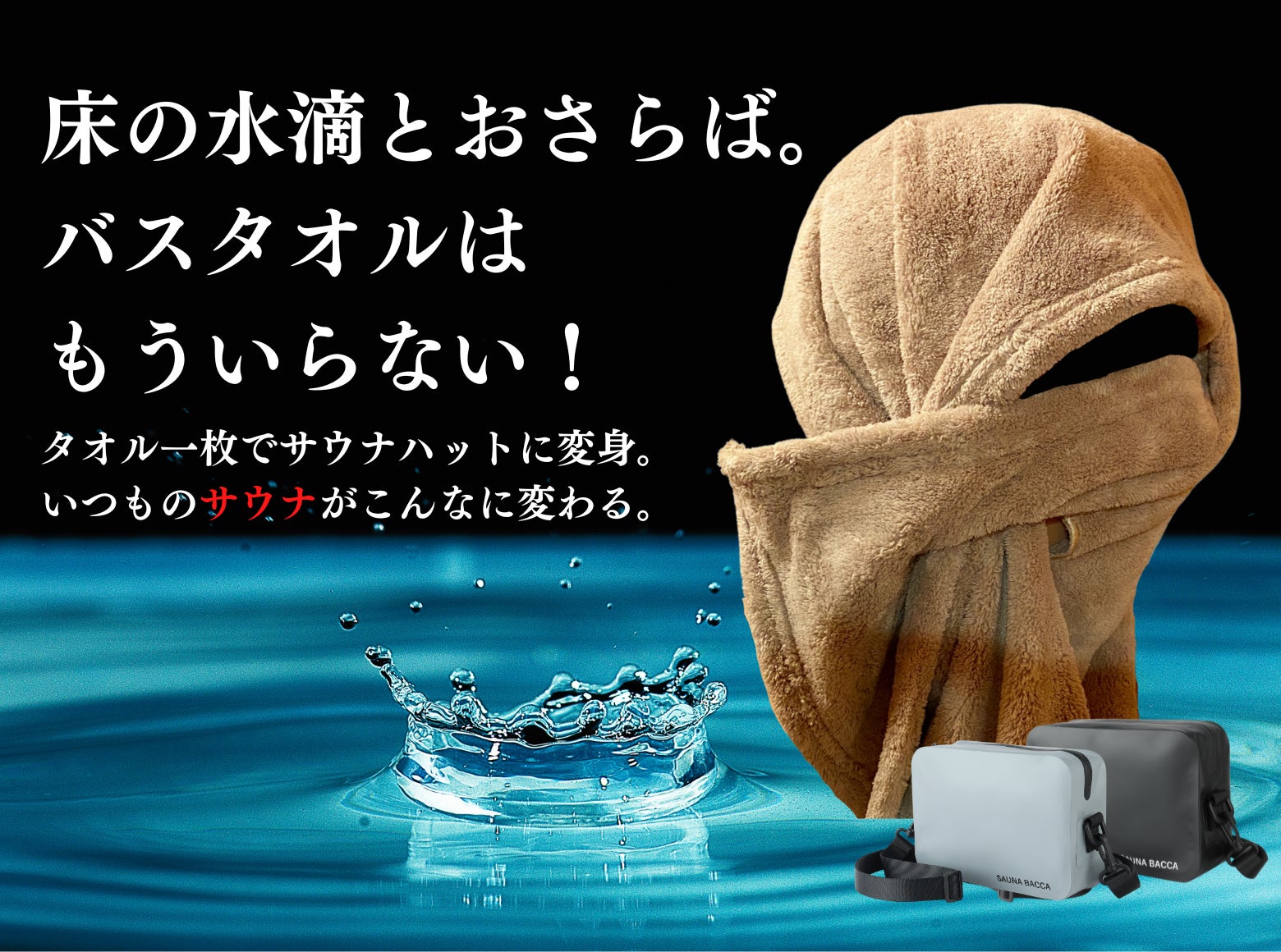 本商品は、代表 斉藤の経験をきっかけに誕生しました。休日や空いた時間にサウナに行けるのは最大の幸せです。しかし密室による飛沫の心配。他人の汗がかかり嫌な思いをしたなどサウナ施設に行く方は誰もが体験しますね。せっかく体を綺麗にしたのに着替える際の脱衣所の床が濡れていて再度足を洗いに行くなどせっかくのサウナが台無しに。そこで同じ悩みを持つ人を助けたいとの思いで、タオル一枚でしっかり頭と顔を守り汗をしっかり拭ける本商品を企画いたしました。