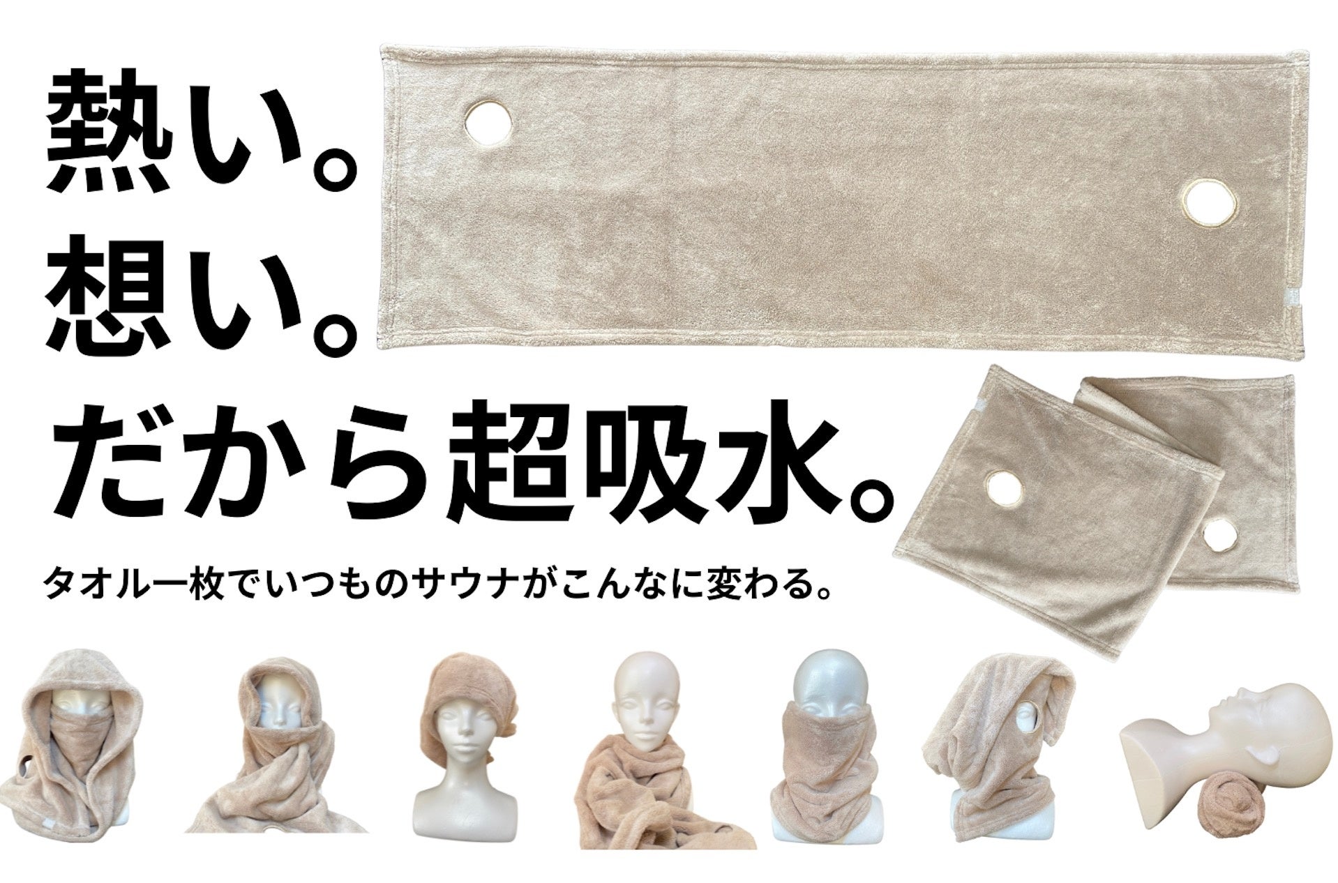 タオルに空いた2つの穴が最大の特徴(意匠権登録申請済み)2つの穴に通すことによりサウナハット、サウナマスク、バンダナ、マフラー、枕などに様々変化。2つの穴が非対称の為様々なサイズに調整可能。もう一つの特徴の吸水性(第三者機関に調査を依頼、実証済み)により濡れた状態でも体が拭けて、バスタオルが要りません。サウナに入る前も中でもしっかり汗を拭けて、周りの人に迷惑をかけません。
