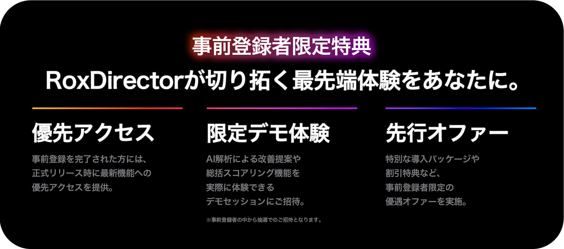 Rox株式会社(本社:東京都渋谷区、代表取締役:四辻 俊昭)は、SNS動画の台本・構成・演出をAIで分析・改善するマーケティング支援ツール『RoxDirector』の事前登録受付を開始いたしました。本製品『RoxDirector』は、AIによる台本添削、構成分析、音声の自動文字起こし、総合スコアリングを一括で実現する動画分析ツールです。従来の感覚に頼った動画制作プロセスを脱却し、誰もが“勝てる構成”をデータで可視化・改善できる環境を提供します。